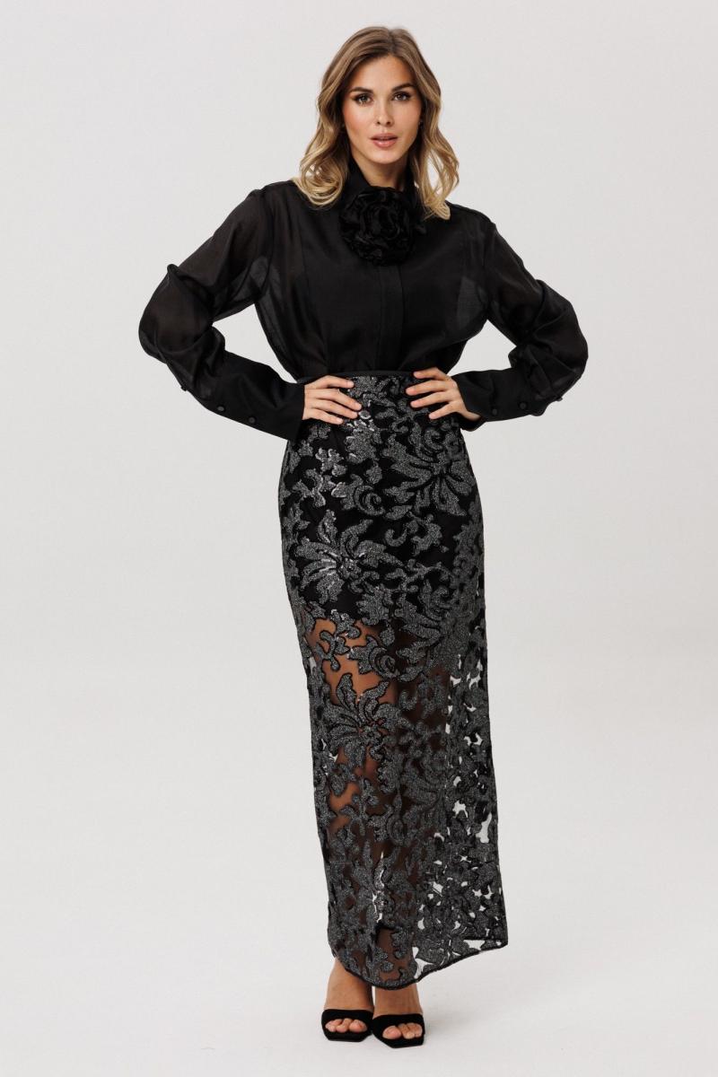 Юбка выполнена из сетки с вышивкой с пайетками. Юбка прямого силуэта, длиной миди. Юбка на притачном поясе, застегивающимя на петлю и пуговицу и на потайную молнию сзади в среднем шве. Юбка без подкладки. Длина юбки - 103 см. 42 44 46 Длина по переду с поясом 103 103 103 Объем по талии 68 72 76 Объем по бедрам 92 96 100 Объем по низу 84 88 92 Ширина пояса 4,5 4,5 4,5
