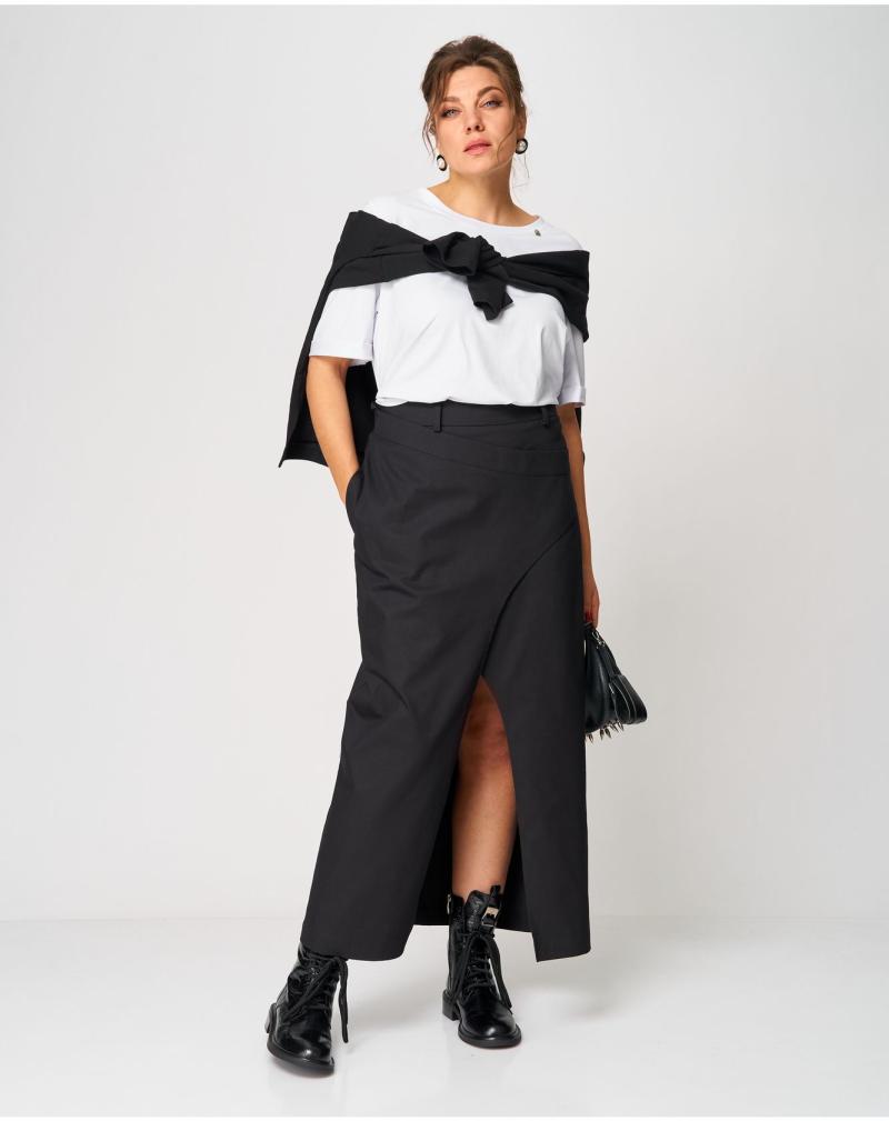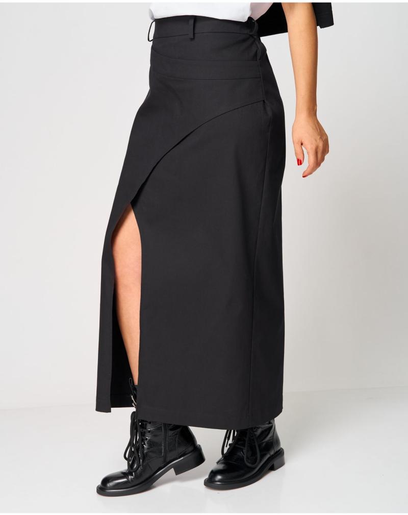 Особое внимание привлекает асимметричный линийный крой и выразительный длинный разрез спереди, который добавляет образу женственность, смелость и лёгкую нотку драматичности. Юбка выглядит одновременно современно, минималистично и очень утончённо, подходит как для будней, так и для особых выходов.