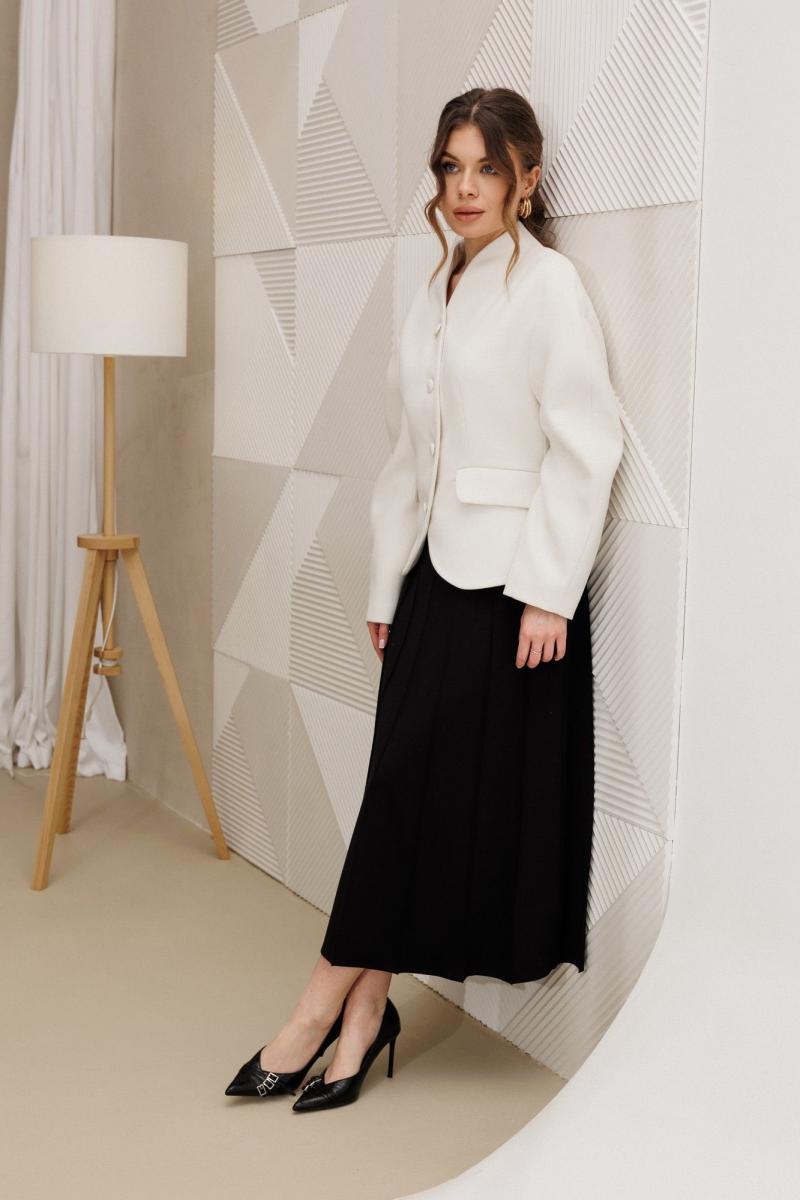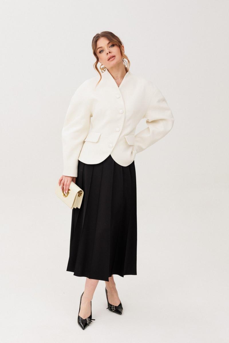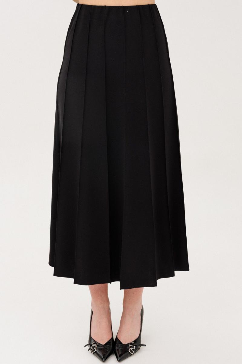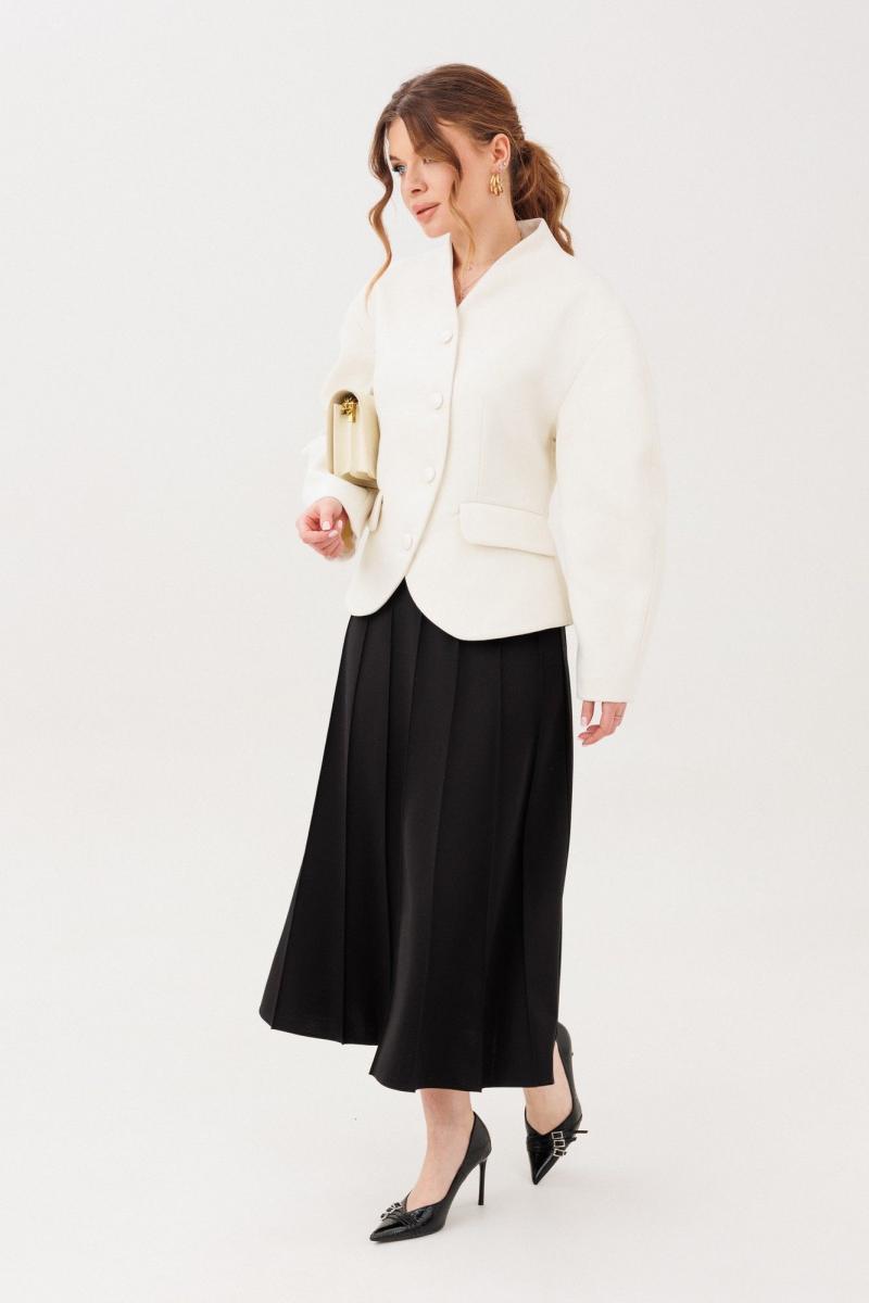 Юбка из трикотажного полотна, умеренного объема, А-силуэта, со складками. Линия талии — на естественном месте. Пояс на эластичной резинке. Длина изделия 83 см 42 От=64, об 94 см, 44 От =68 см, об=98 см, 46 ОТ=72см, об=104 см 48 ОТ=76 см, ОБ=108 см 50 ОТ =80 см, об=112 см 52 От = 84 см, ОБ= 116 см