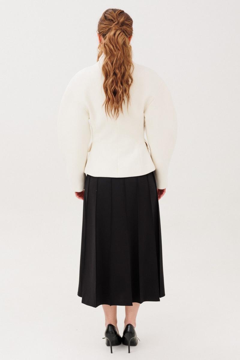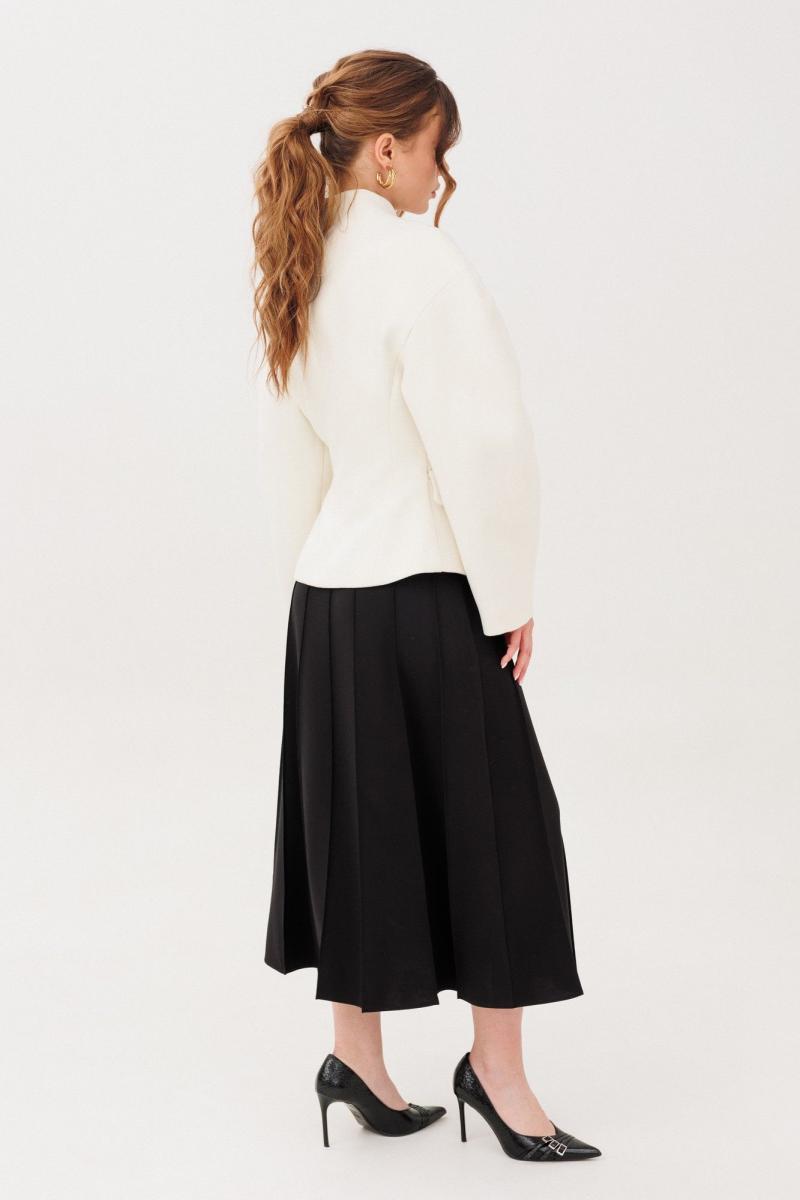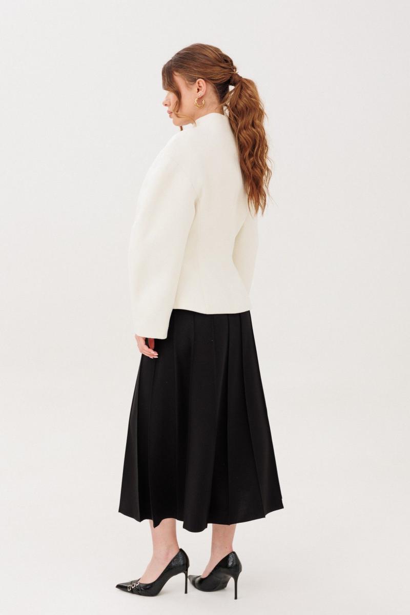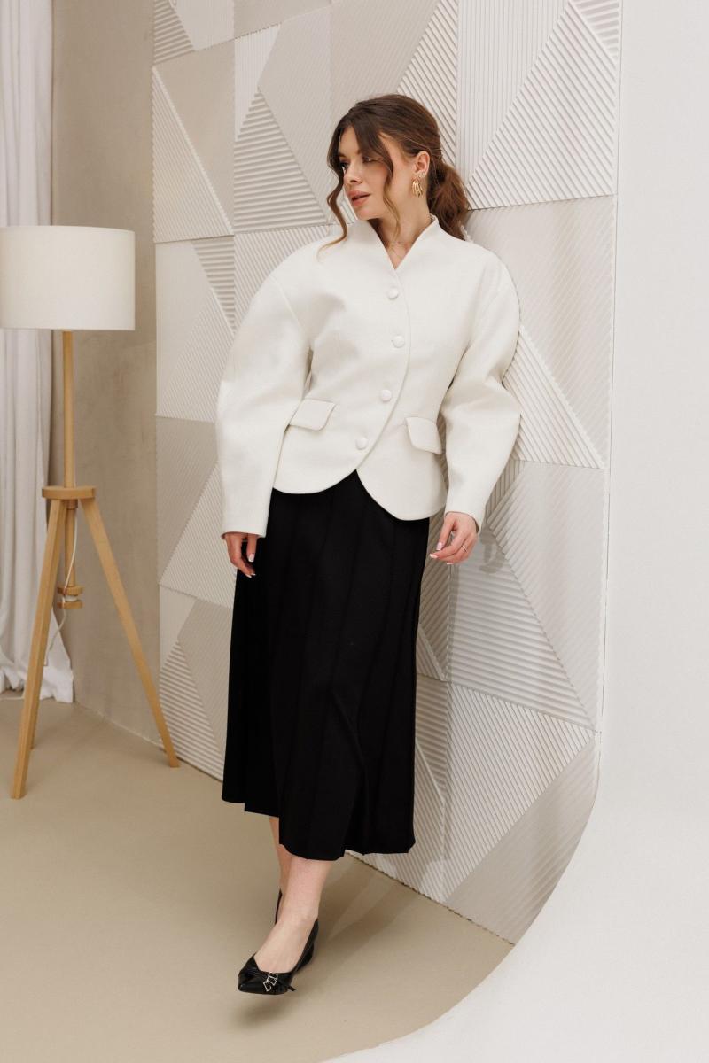 Юбка из трикотажного полотна, умеренного объема, А-силуэта, со складками. Линия талии — на естественном месте. Пояс на эластичной резинке. Длина изделия 83 см 42 От=64, об 94 см, 44 От =68 см, об=98 см, 46 ОТ=72см, об=104 см 48 ОТ=76 см, ОБ=108 см 50 ОТ =80 см, об=112 см 52 От = 84 см, ОБ= 116 см