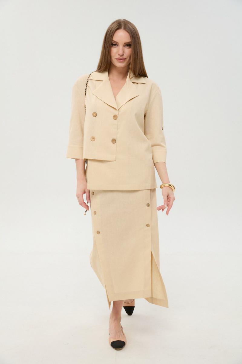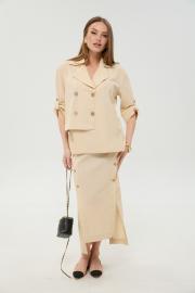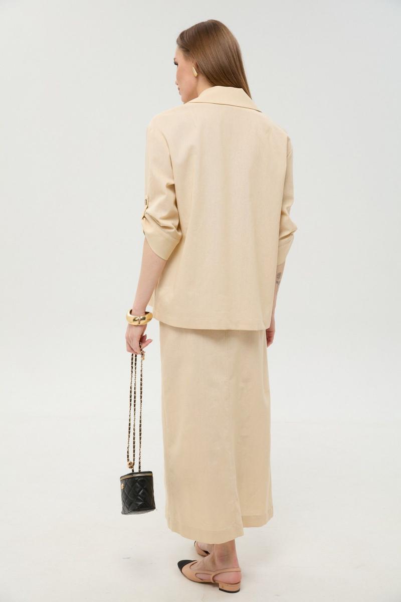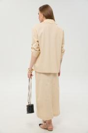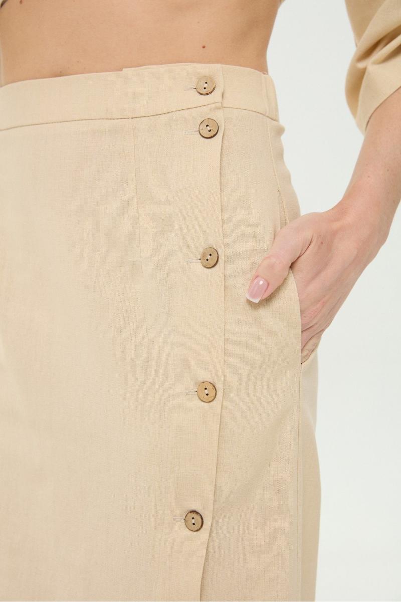Юбка длиной миди, расклешенная к низу, с асимметричным низом. Пояс притачной, по спинке собран на резинку. Переднее полотнище состоит из трех частей. Правая часть скреплена отделочной строчкой и кнопками. В боковых швах изделия расположены карманы. По спинке изделия идёт средний шов и две вытачки для удачной посадки по фигуре. Юбка без подкладки.
