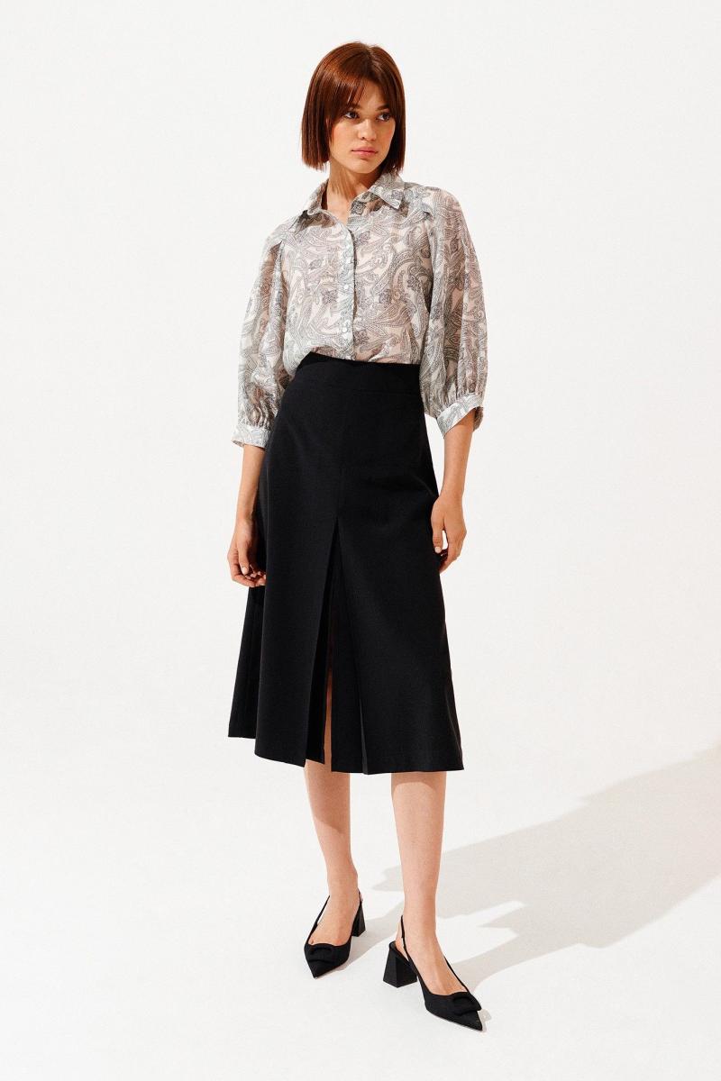 Базовая юбка из плотного вискозного полотна с одинаковыми разрезами спереди и сзади.