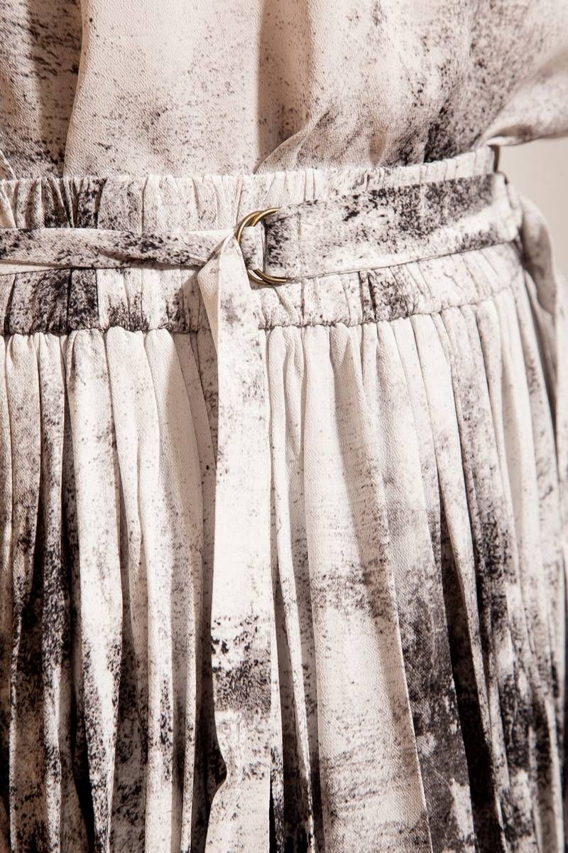 Юбка из натуральной вискозной ткани с абстрактным дизайном и эффектом «крэш». Пояс притачной на резинке, дополнен съемным узким поясом на полукольцах.