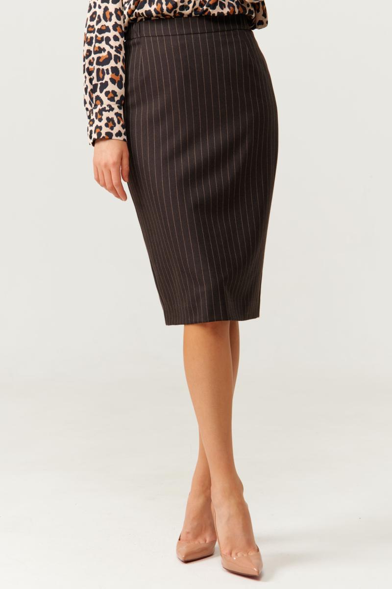 Женская юбка прямого силуэта из поливискозной ткани, идеально подходящая для повседневной носки. Верхний срез юбки оформлен притачным поясом с вставкой на резинке в боковой части, внутренний край которого украшен декоративной леопардовой тесьмой, добавляющей стильный акцент. Застежка расположена в задней части пояса и выполнена на одну обметанную петлю и пуговицу, дополнена тесьмой-молнией в среднем шве для удобства и надежности. В передней части юбки расположена декоративная шлица в среднем шве. Переднее полотнище украшено двумя талиевыми вытачками, создающими аккуратный силуэт. Задняя часть юбки также оформлена двумя талиевыми вытачками. Юбка полностью на поливискозной подкладке, что делает ее более удобной и приятной к телу. Этот стильный и практичный вариант юбки коричневого оттенка подойдет для создания повседневных образов с нотками изящества и современного стиля.