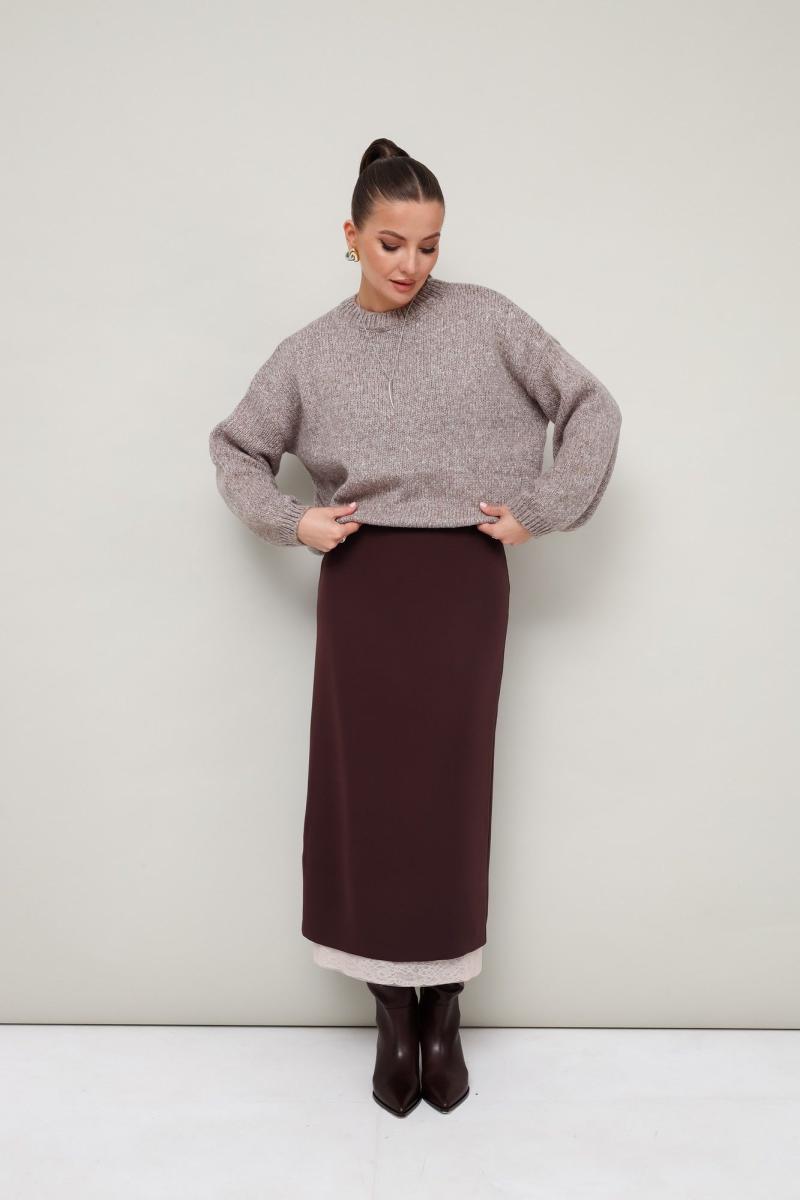 Юбка-карандаш прямого силуэта в длине миди. Верхняя юбка выполнена из костюмно-плательной ткани, пояс на обтачке, застёжка на потайную молнию в среднем шве по спинке. Нижняя юбка на резинке по поясу, низ обработан кружевной отделкой с сеткой. Для удобства движения сзади по юбкам обработаны разрезы.