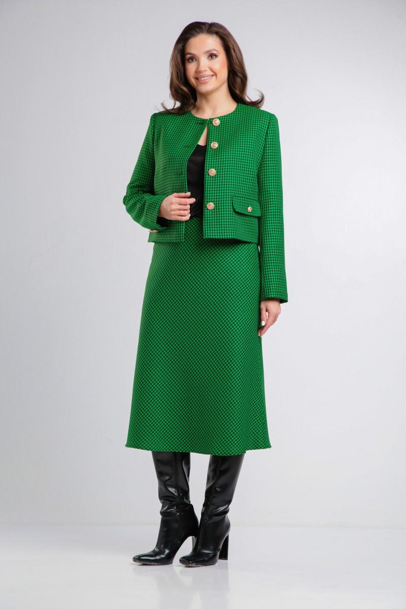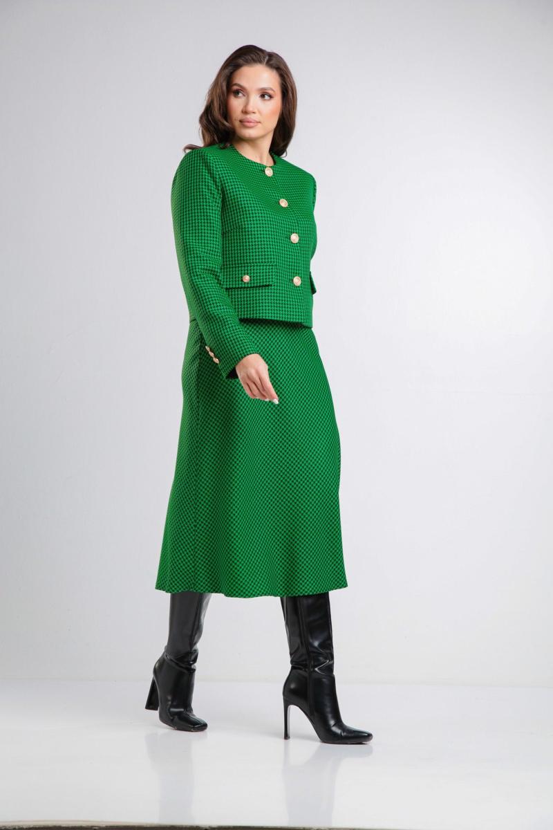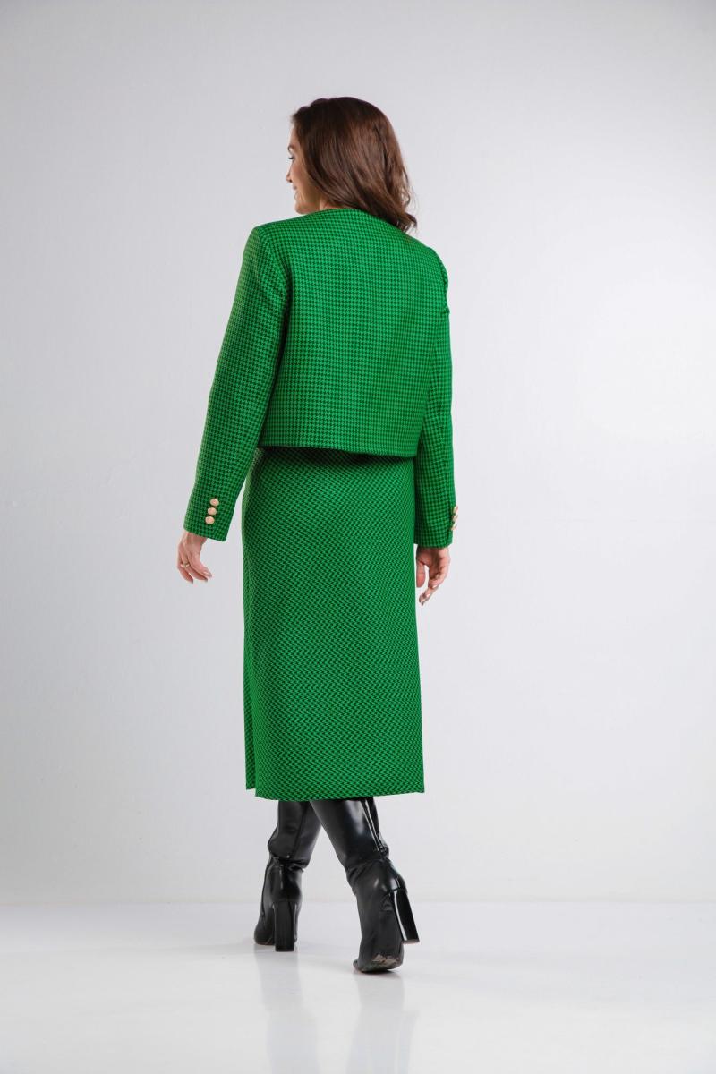 Юбка без подкладки из костюмной ткани, по косой, слегка расширенная к низу, с застежкой-«молнией» в боковом шве, верхний срез обработан обтачкой. Длина 80