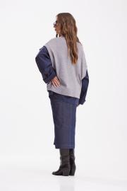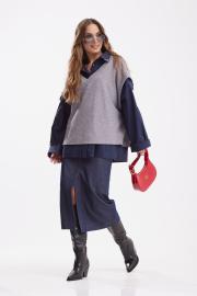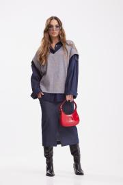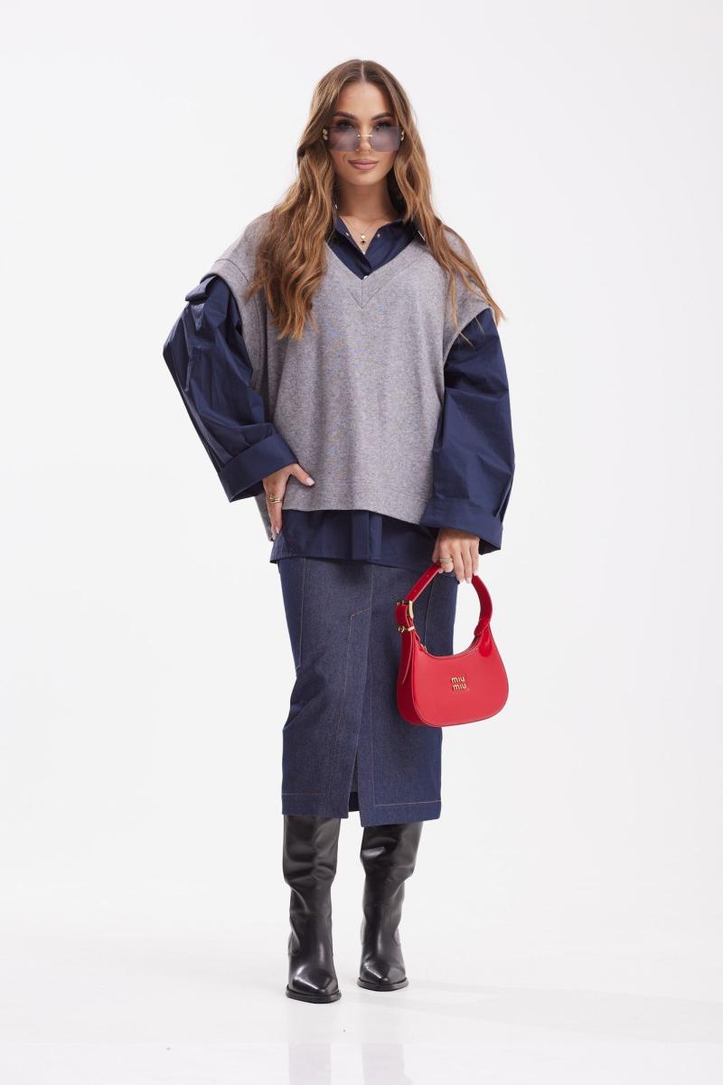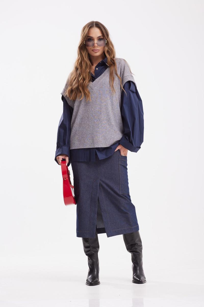 Юбка прямая из джинсовой ткани. Длина миди. Верх на поясе со шлевками. Застежка по переду на молнию и кнопку на поясе. В комплекте съемный ремень.  В боковых швах карманы. По низу переда юбки шлица. На боковых швах накладные карманы. Длина юбки 85 см. Измерения по готовому изделию 44 р-р: ОТ - 79 см., ОБ - 95 см. 46 р-р: ОТ - 83 см., ОБ - 99 см. 48 р-р: ОТ - 87 см., ОБ - 103 см. 50 р-р: ОТ - 91 см., ОБ - 107 см. 52 р-р: ОТ - 95 см., ОБ - 111 см.