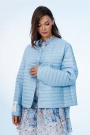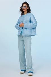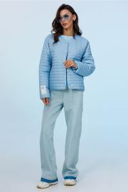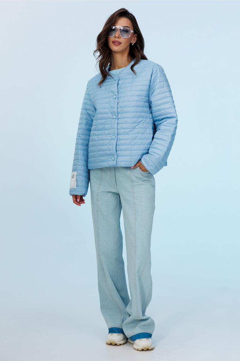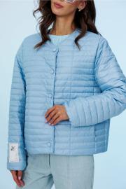 Куртка демисезонная короткая (t до +5С) прямого силуэта с втачным рукавом внизу на резинке и спущенной линией плеча. Полочка с центральной застёжкой на кнопки и с закруглёнными края борта вверху и с карманами в рельефах. По горловине, бортам куртки вставлен кант. Куртка без воротника, вырез горловины округлый. На правом рукаве нашивка с логотипом "BUTER". Куртка из плащевой ткани с фигурной стежкой на синтепоне (isosoft 100г/м²) и подкладке.