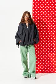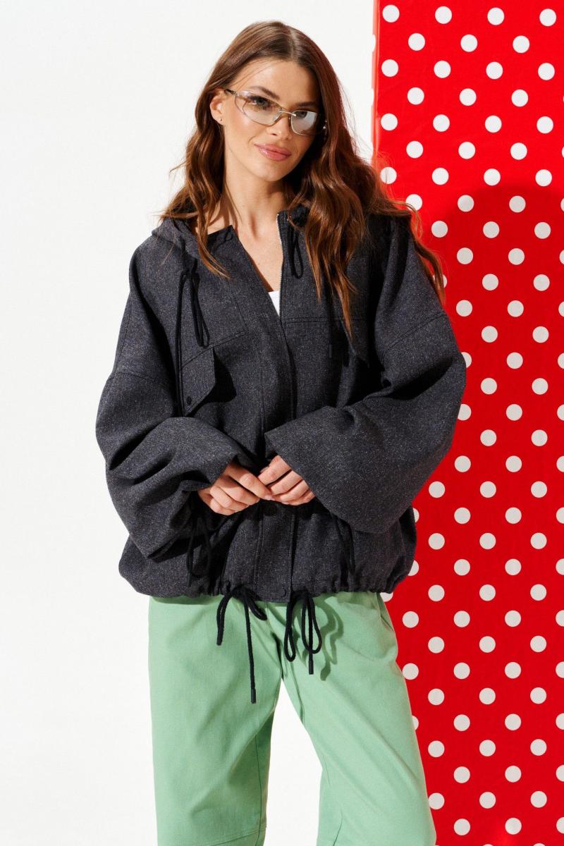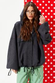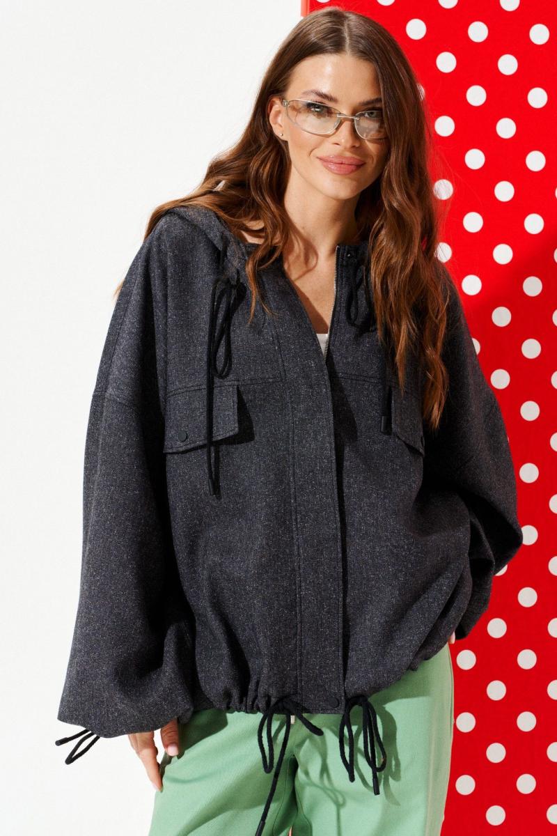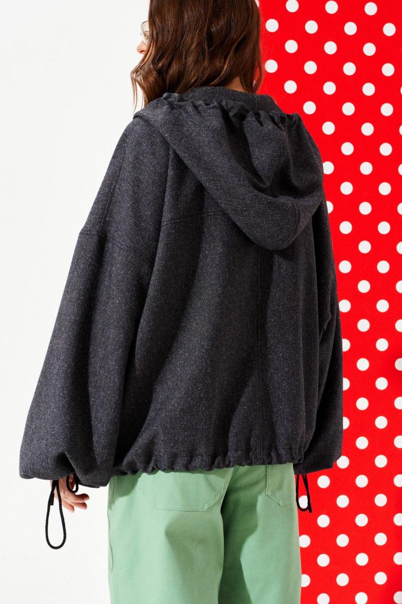 Куртка свободного объема, прямого силуэта, с центральной застежкой на тесьму-молнию и кнопки на притачной планке, с капюшоном, на подкладке. Детали переда с отрезной кокеткой и нагрудными накладными клапанами. Спинка с отрезной кокеткой и средним швом. В боковых швах расположены карманы. Рукав втачной одношовный, длинный. Нижний срез рукава с эластичной тесьмой. Низ изделия, капюшон, нижний срез рукава оформлены кулиской со шнуром-завязкой и наконечниками.