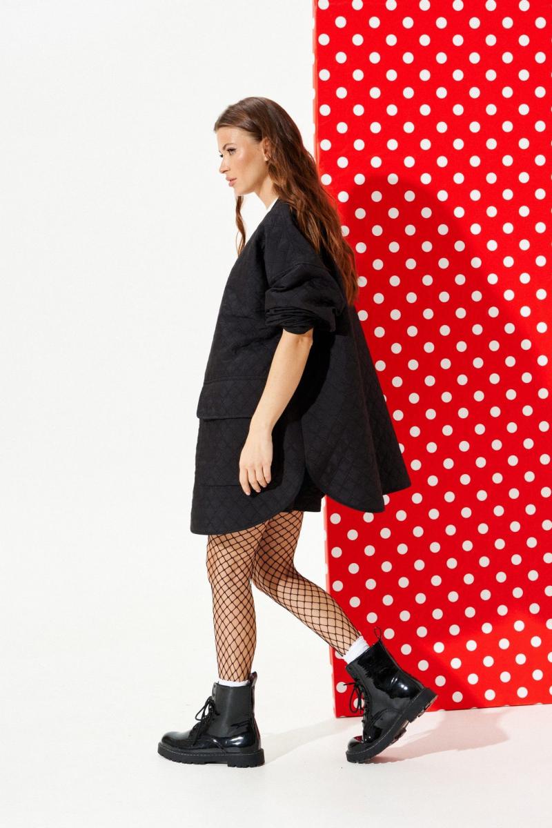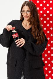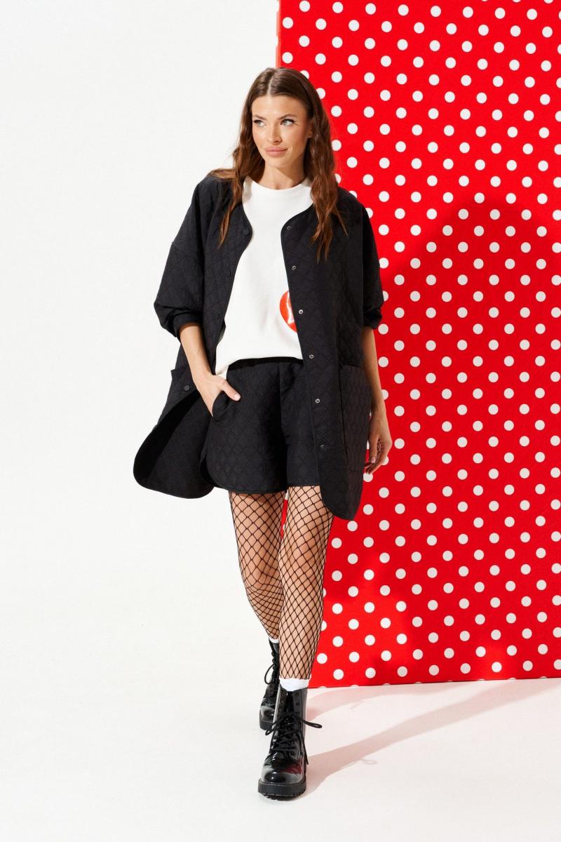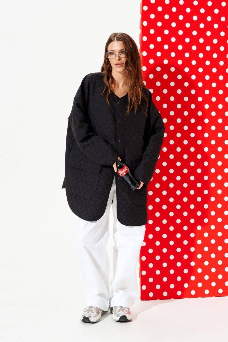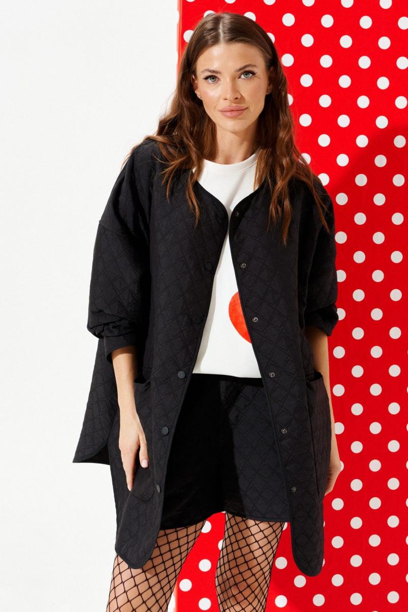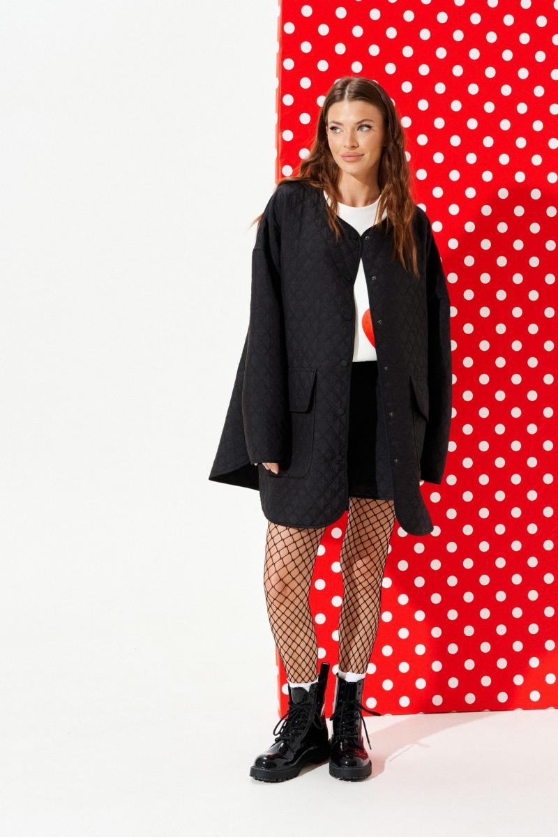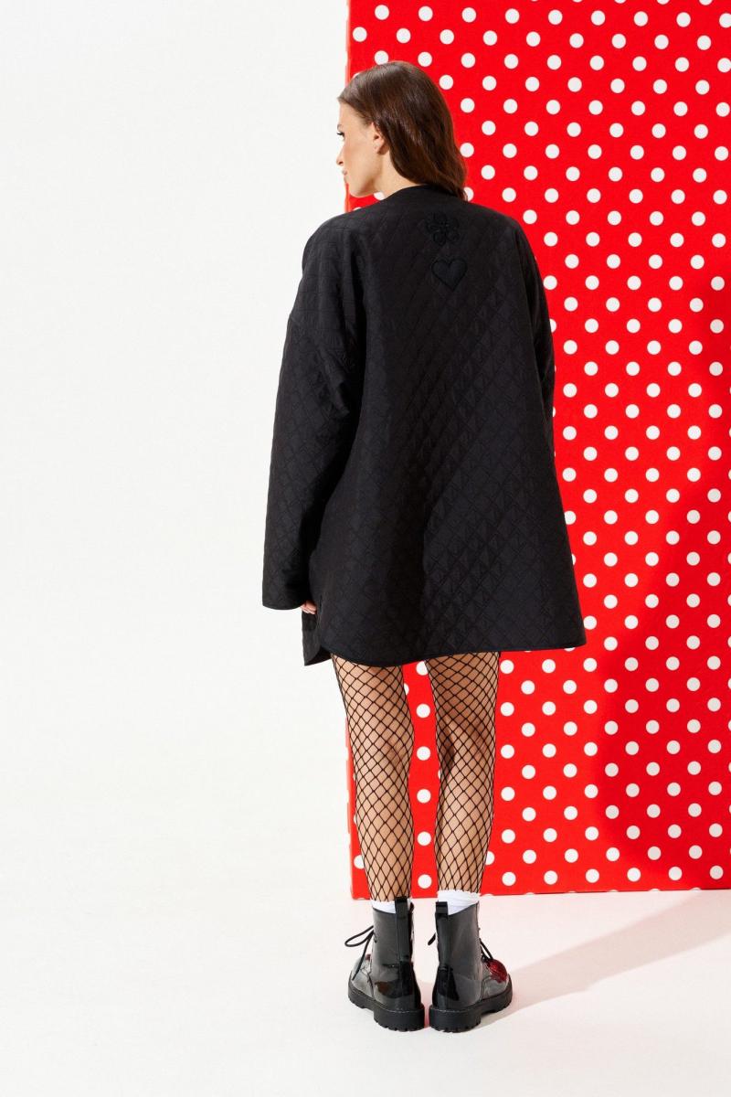 Куртка из стеганой куртачной ткани свободного объема, расширенная к низу, с центральной застежкой на кнопки. Детали переда с накладными карманами с клапанами. Спинка цельная с настрочными нашивками «Цветок» и «Сердце». Линия низа фигурная. Рукав втачной, длинный. Горловина, борт, нижний срез куртки и рукава обработаны окантовочной бейкой.