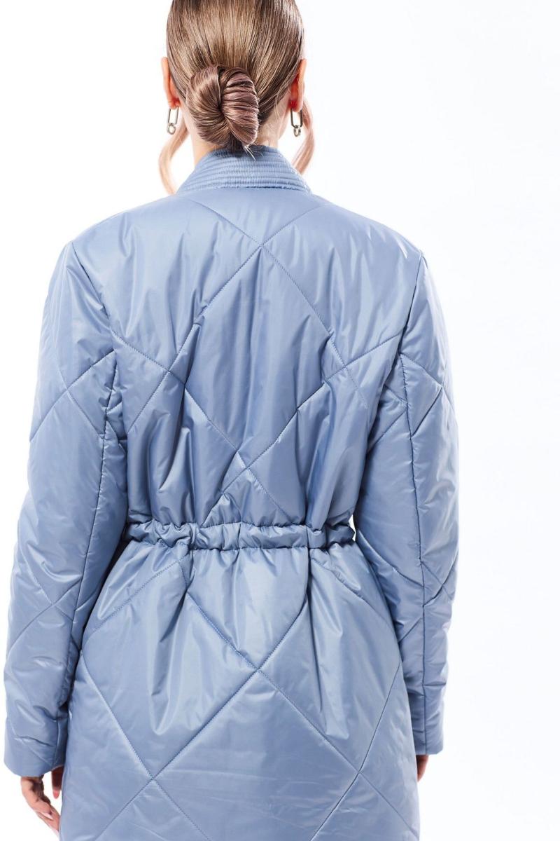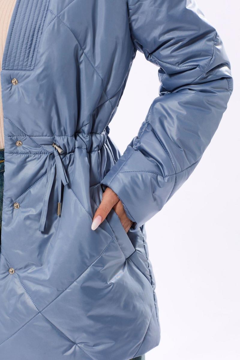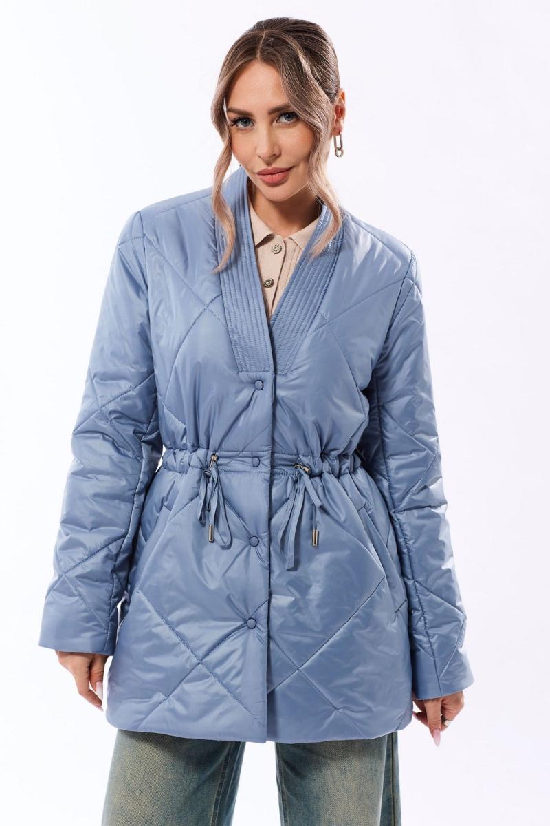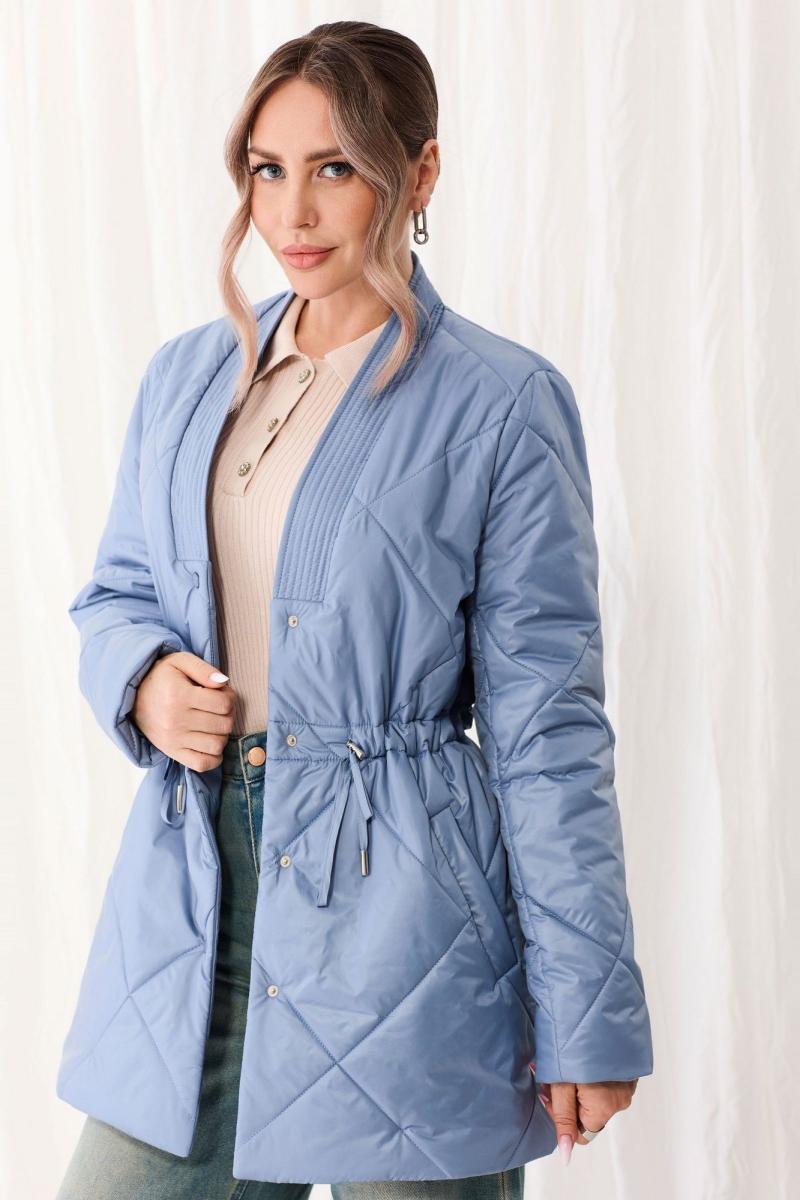 Куртка утепленная, с центральной застежкой на кнопки, втачным воротником, V-образным вырезом горловины. На полочках расположены прорезные карманы с листочками. На линии талии расположена кулиса со шнуром. Толщина синтепона 150г/м2, , изделие рекомендуется до -5 градусов. Куртка на подкладке.