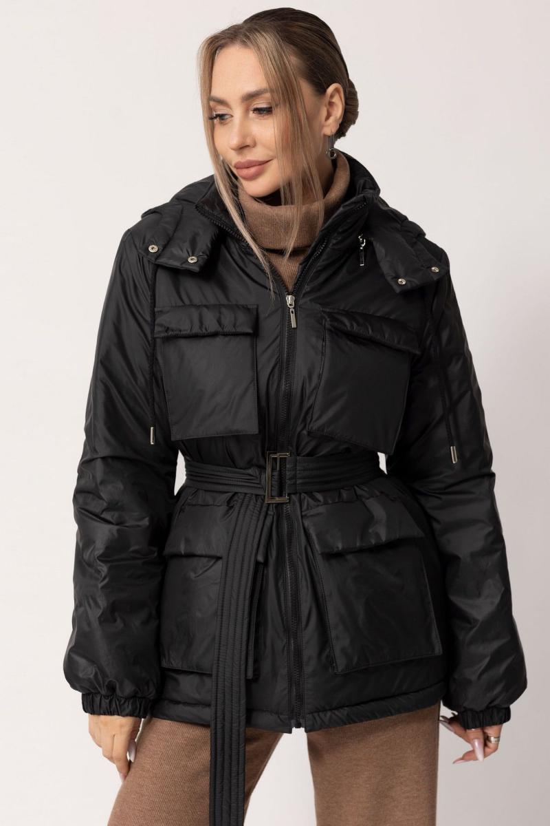 Куртка прямого силуэта, утепленная, с центральной застежкой на молнию, втачным воротником- стойкой, капюшоном, пристегивающимся на молнию. На полочках, на уровне груди и на уровне бедер расположены накладные карманы с клапанами. Рукав втачной, с отрезной манжетой, присборенной на резинку. Куртка со сьемным поясом. Куртка на утепленной подкладке.