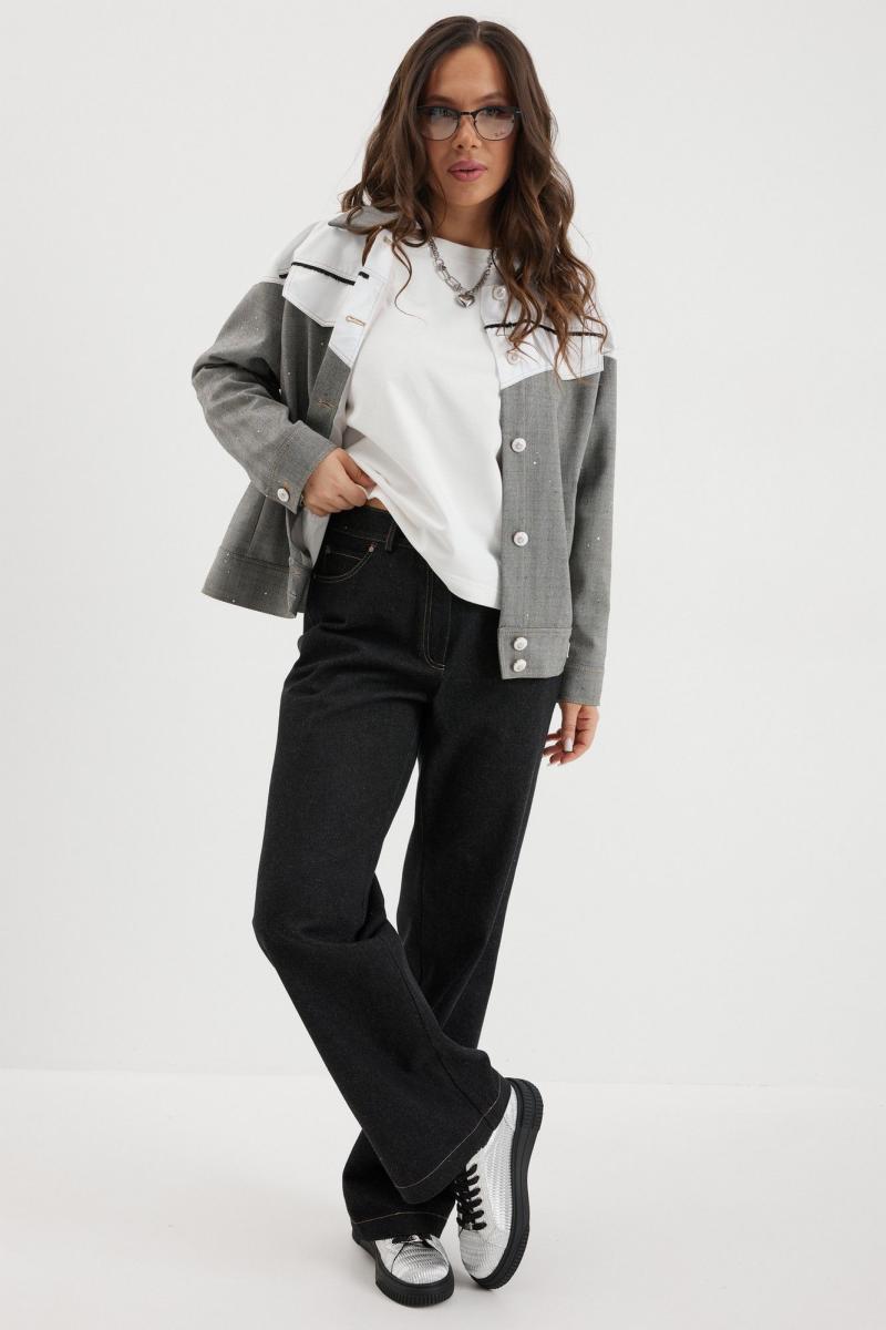 Стильный комплект из куртки и джинсовых брюк. Куртка прямого рубашечного кроя, на подкладке, с центральной застежкой на красивые пуговицы. Горловина обработана отложным воротником. Рукав полной длины с притачной манжетой дополненной застежкой на пришивную пуговицу. Выполнена из двух видов ткани: костюмной ткани с редкими мерцающими пайетками и плащевой ткани. Куртка дополнена удобными боковыми карманами. Джинсы прямого классического кроя с застежкой гульфик на пуговицу и металлическую молнию. Посадка средняя. Дополнены удобными боковыми и задними карманами. Длина куртки от плечевого шва 62см. Длина рукава 60см. Длина брюк по боковому шву 105см.