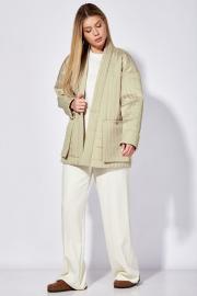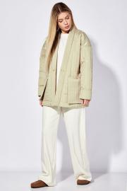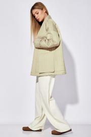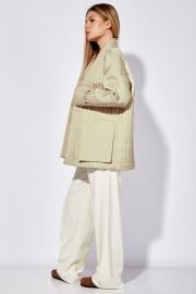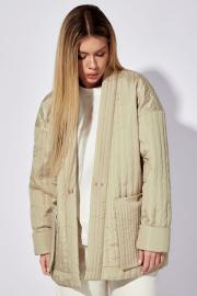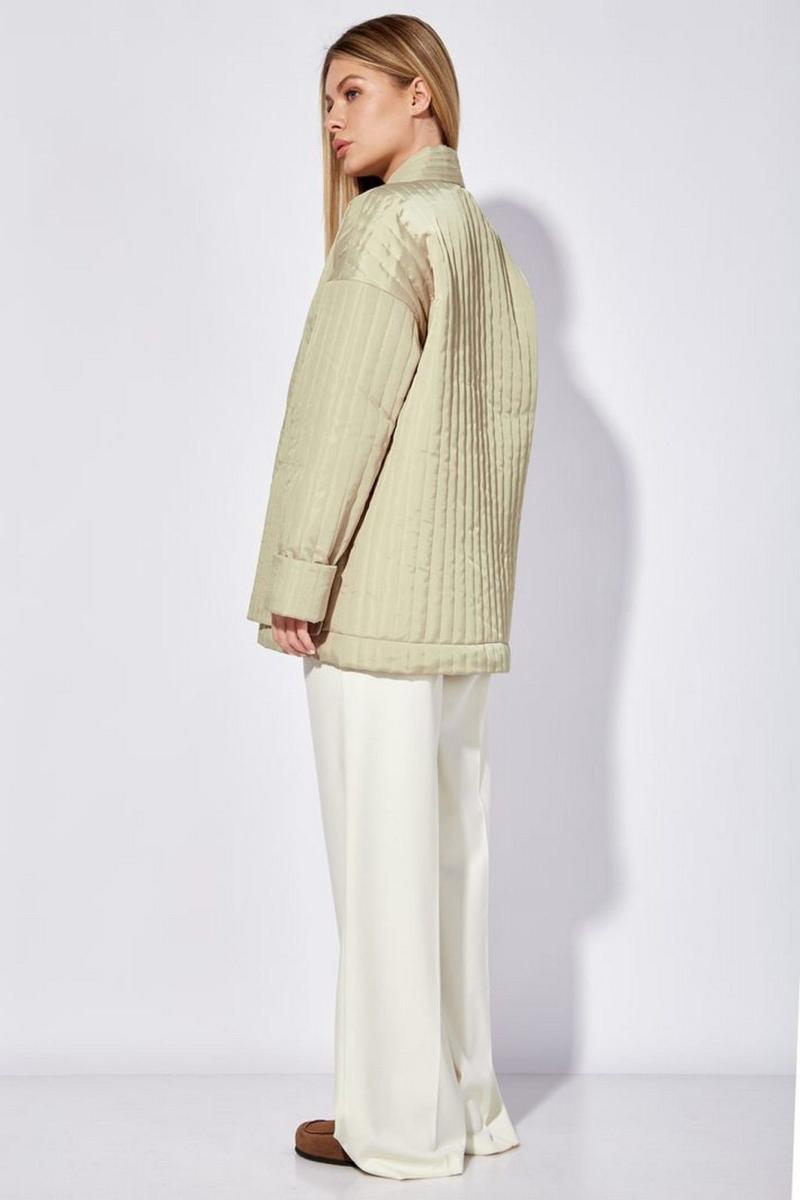 Куртка женская oversize прямого силуэта на запах из матовой бежевой плащевки с вертикальной стежкой разной ширины. Горловина с притачной планкой. Спущенная линия плеча и широкие рукава создают мягкую форму. Низ рукавов с широким отворотом. Спереди два декоративных кармана на кнопках. вход в карман под накладными карманами через прорезной карман врамку. Куртка застегивается на пробивные кнопки по талии. Куртка без подкладки.