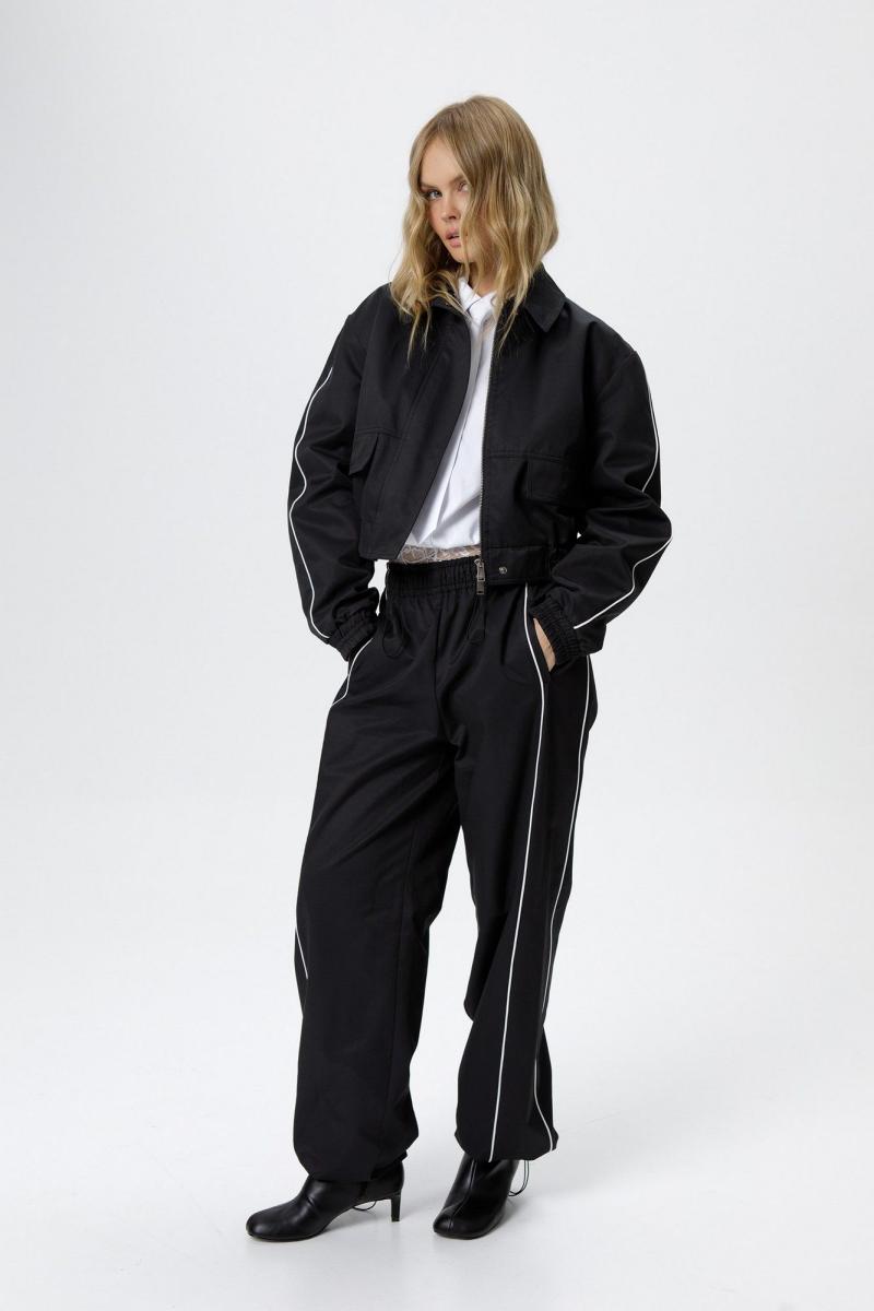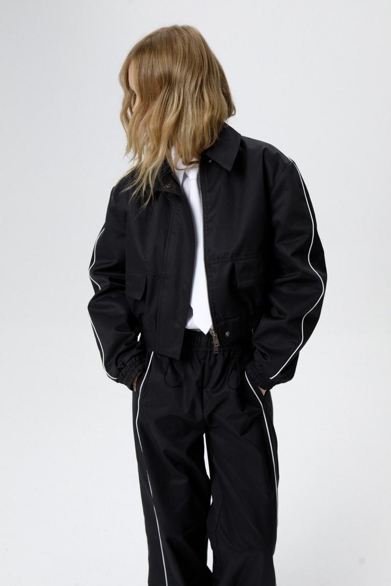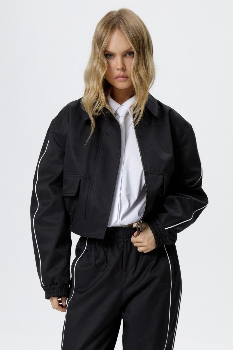 Укороченная спортивная куртка-бомбер с кантами. Детали: прямой силуэт, воротник, пояс переда и спинки на резинке, застежка на молнию, рукава длинные, функциональные карманы, спинка со средним швом, куртка на подкладке. Длина куртки по спинке с поясом около 49 см в размерах 40-46 и около 50,5 см в размерах 48-52, длина рукава около 60 см+ спуск плеча около 2 см