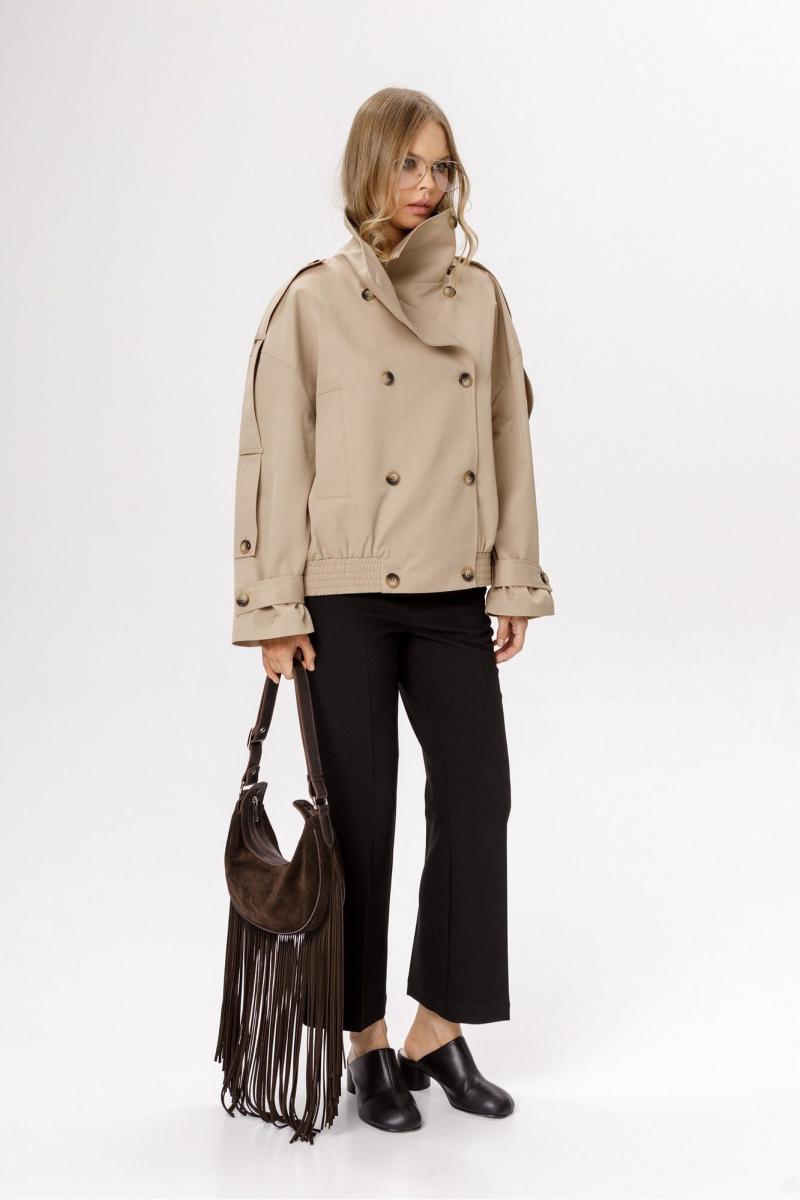 Укороченный оверсайз тренч с длинными патами (приобрести брюки с фото можно по арт. 6557). Детали: прямой силуэт, спинка с кокеткой и средним швом, высокий воротник-стойка, двубортная застёжка на петли и пуговицы, пояс переда и спинки на резинке, паты вдоль и по низу рукава, функциональные карманы по переду, тренч на подкладке. Длина по спинке без стойки около 60 см в размерах 40-46, около 64 см в размерах 48-52, длина рукава + плечо около 48+23 см