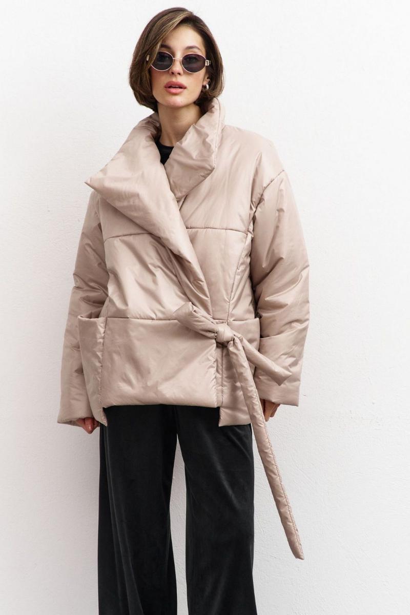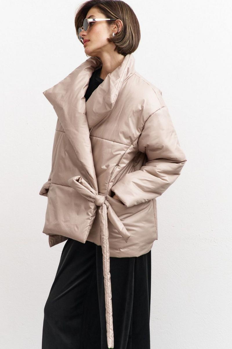 Куртка свободного кроя: -асимметричный низ -сбоку притачной несъёмный пояс - накладные карманы по бокам -отложной воротник-стойка .