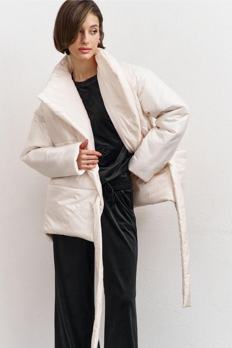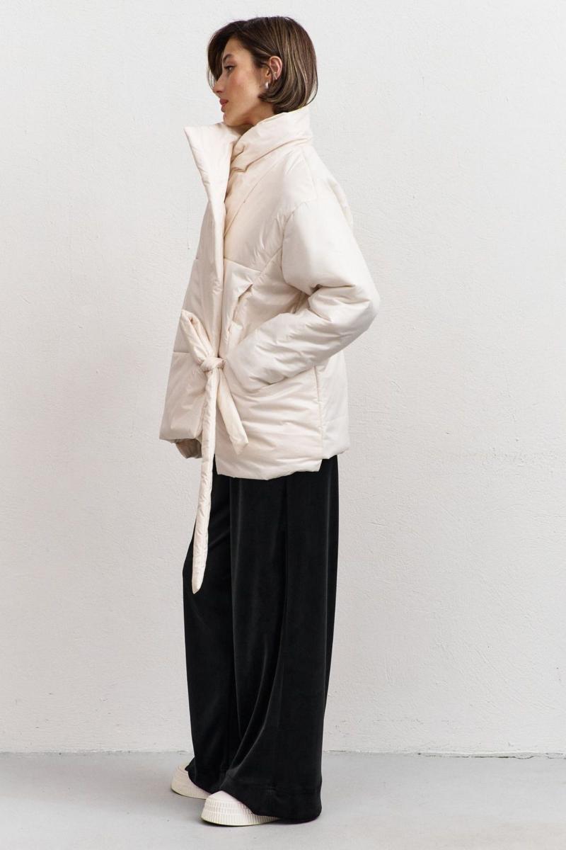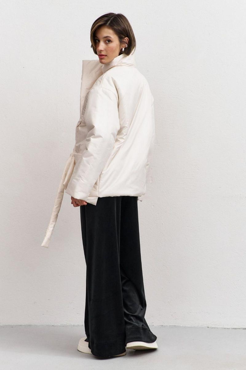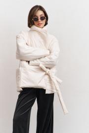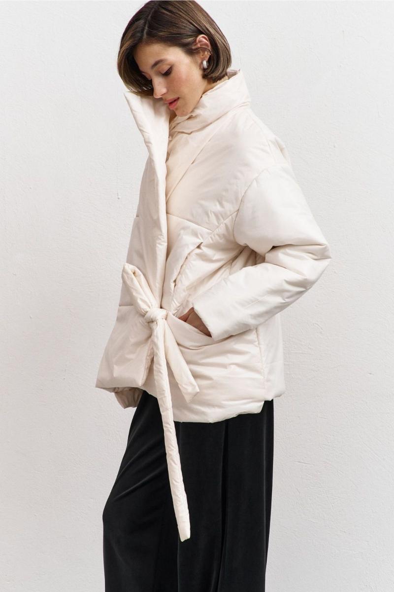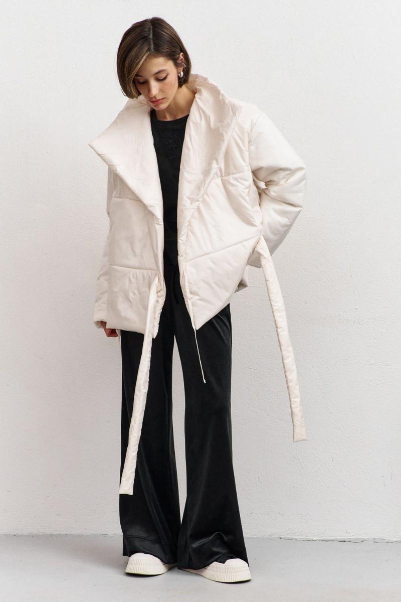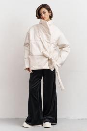 Куртка свободного кроя: -асимметричный низ -сбоку притачной несъёмный пояс - накладные карманы по бокам -отложной воротник-стойка .