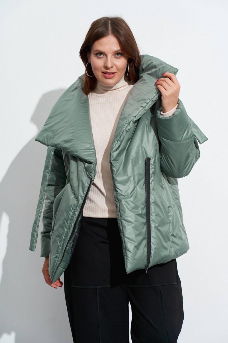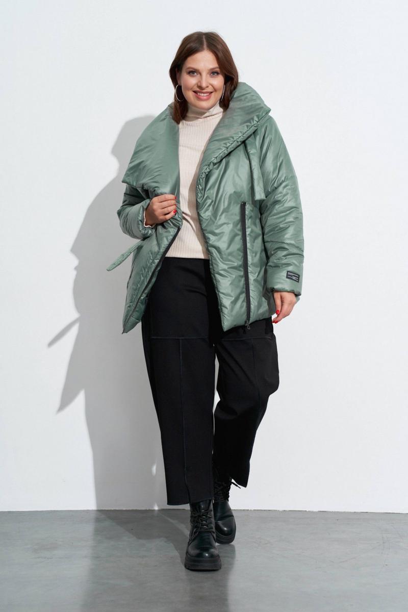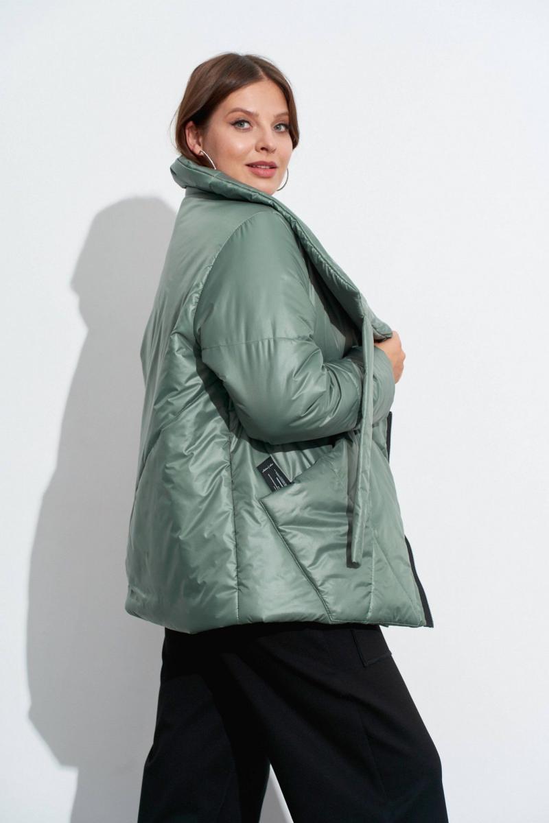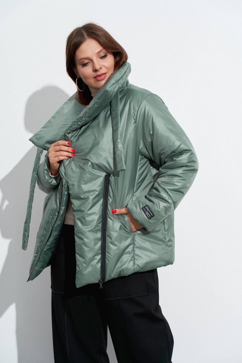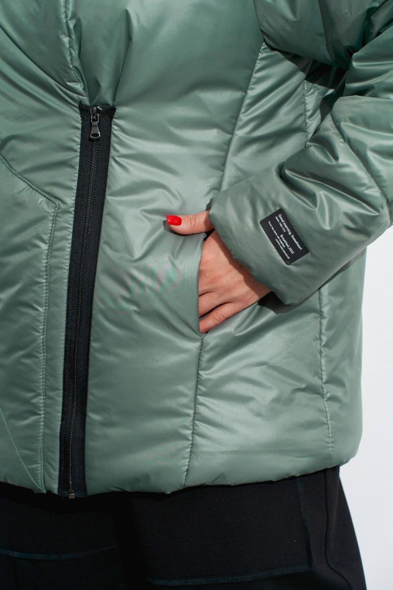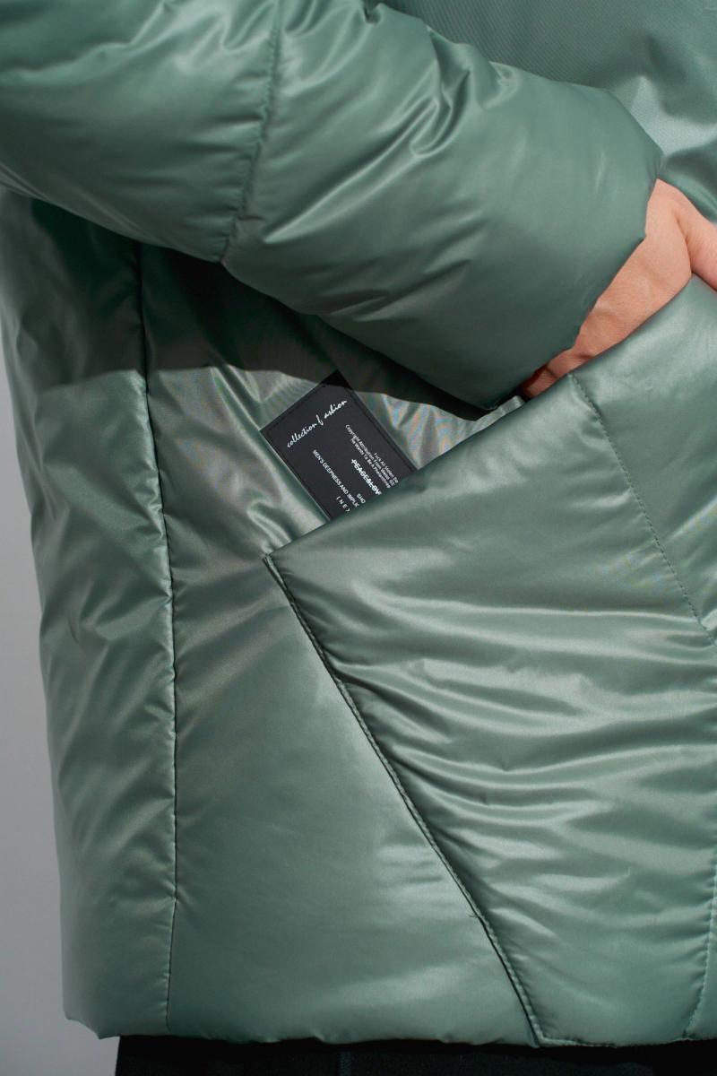 Куртка на утеплителе с ассиметрично расположенной застёжкой. На деталях переда обработаны: накладной карман справа и карман в рельефе слева. Застёжка из открыто настроченной молнии. Объёмный воротник-стойка подвязывается слева у плеча . Рукава одношовные, с декоративными строчками. Изделие на подкладке. Длина по спинке ок. 74 см. в 52м.