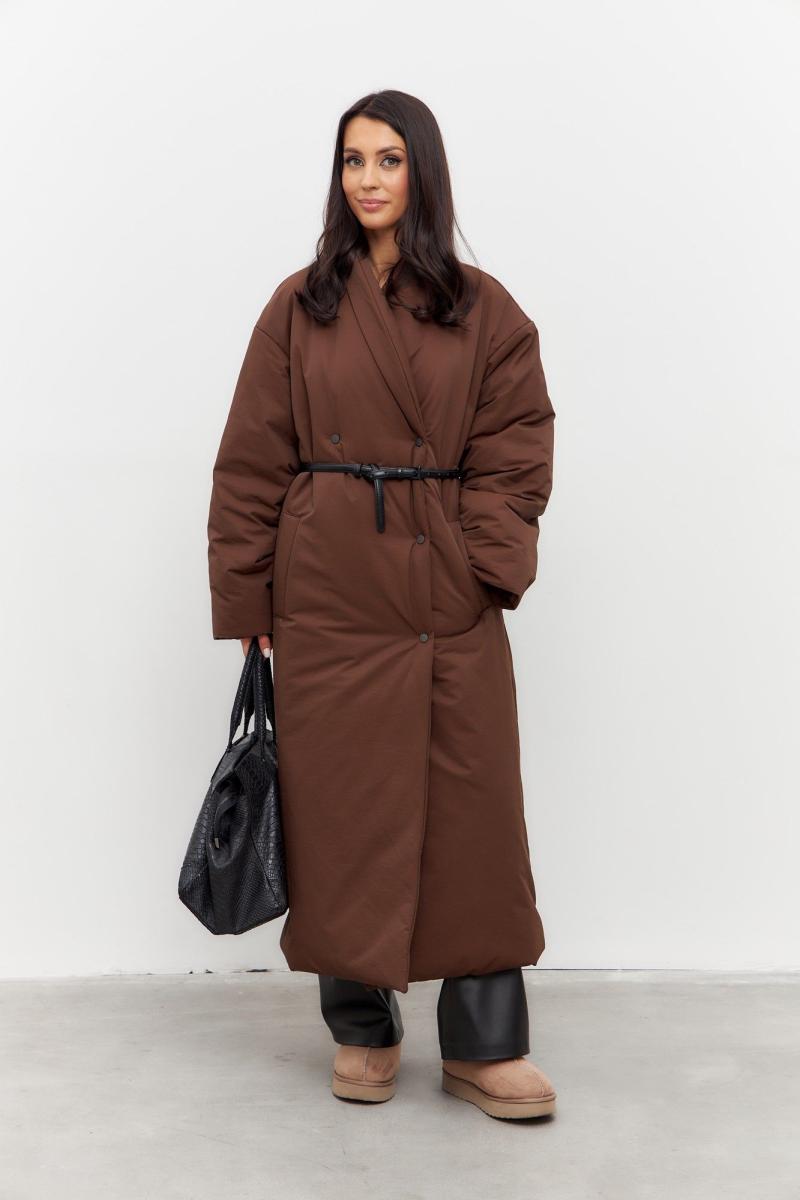 Пальто в коричневом цвете. Пальто двубортное, с застежкой на кнопки. Рукав спущенный. Пальто на синтепоне. В комплекте съемный пояс.