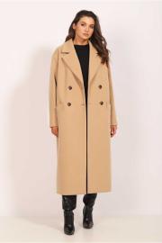 Пальто женское прямого силуэта, выполнено из пальтовой фактурной ткани. По переду нагрудные вытачки, застежка центральная двубортная на четыре прорезные петли и пуговицы, карманы прорезные с клапанами. Рукава двух шовные втачные со спущенным плечом. Центральный шов спинки заканчивается шлицей.