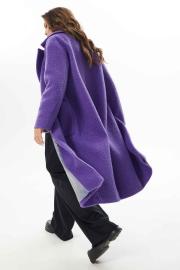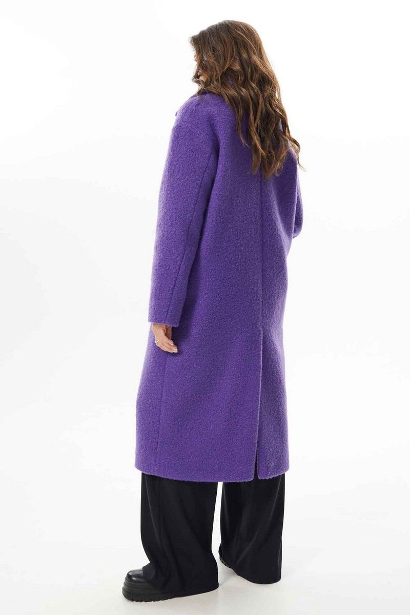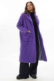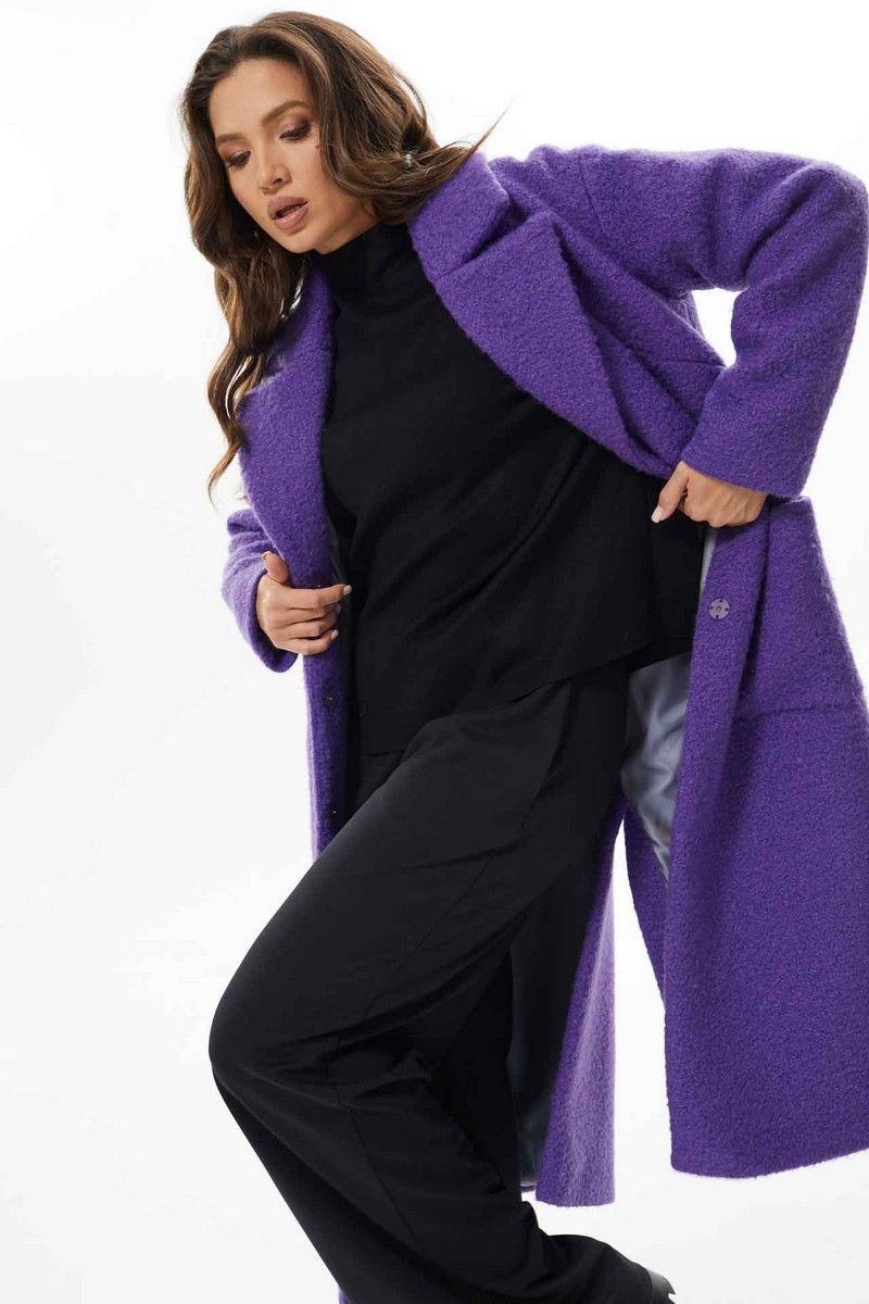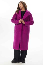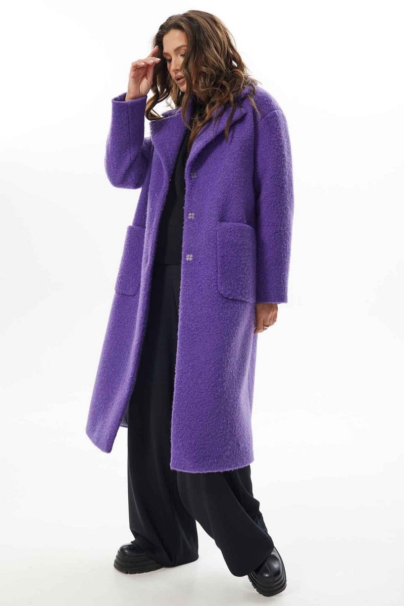 Пальто женское из пальтовой фактурной ткани с легким ворсом, прямого силуэта, на подкладке. С отложным воротником. Рукав двух шовный со спущенным плечом. Застежка центральная однобортная на пришивных кнопках, карманы накладные. По спинке средний шов заканчивается шлицей.