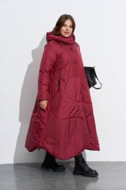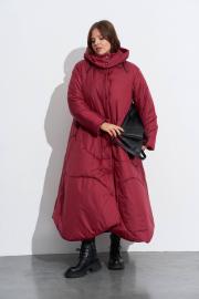 Длинное пальто на утеплителе, со стойкой и съёмным капюшоном. Детали спинки и переда собраны из хаотично отстроченных ,фигурно разрезанных частей. Карманы прорезные на молнии, застёжка на кнопках. Рукава одношовные. Низ переда и спинки фигурный. Изделие на подкладке. Длина по спинке до выреза ок.127 см. в 52м.