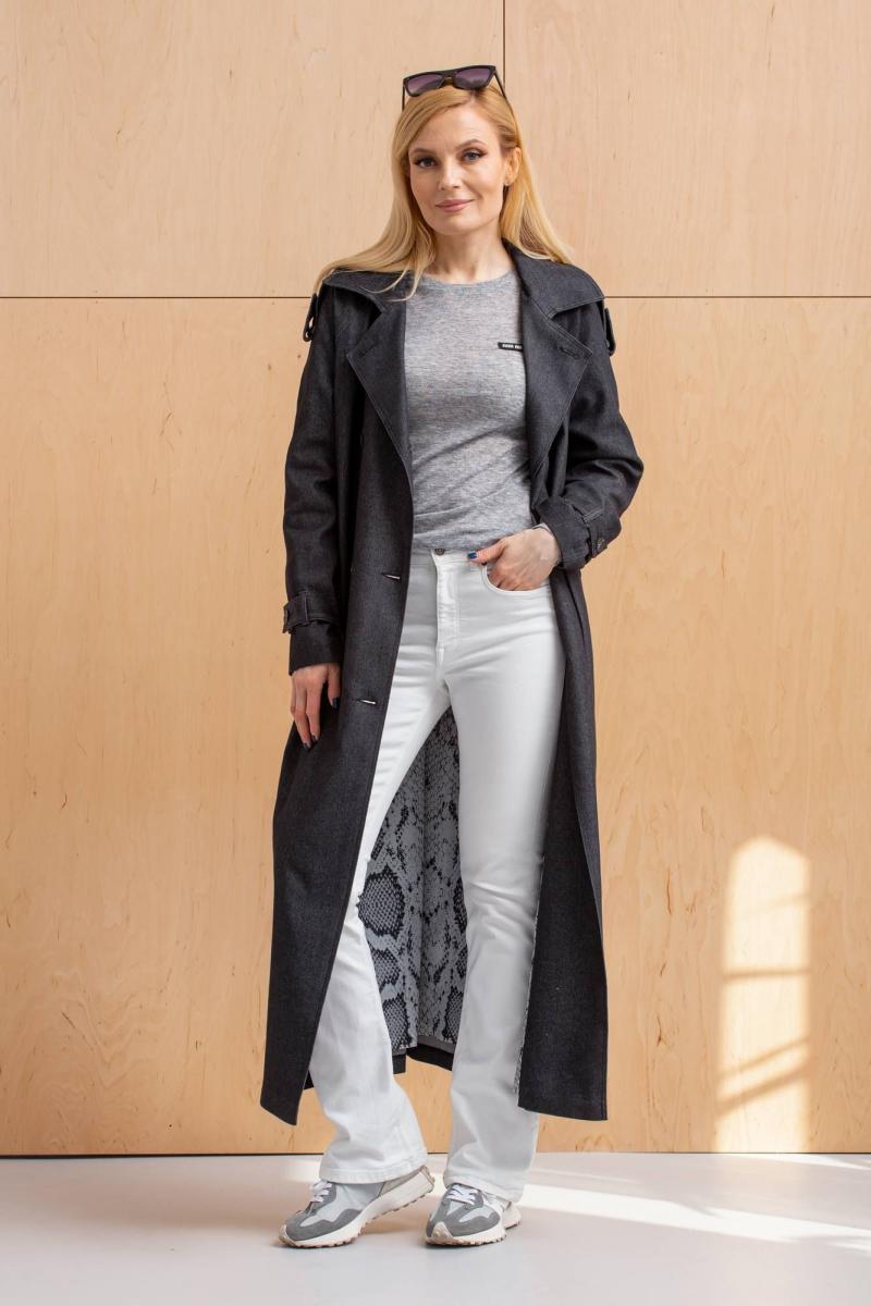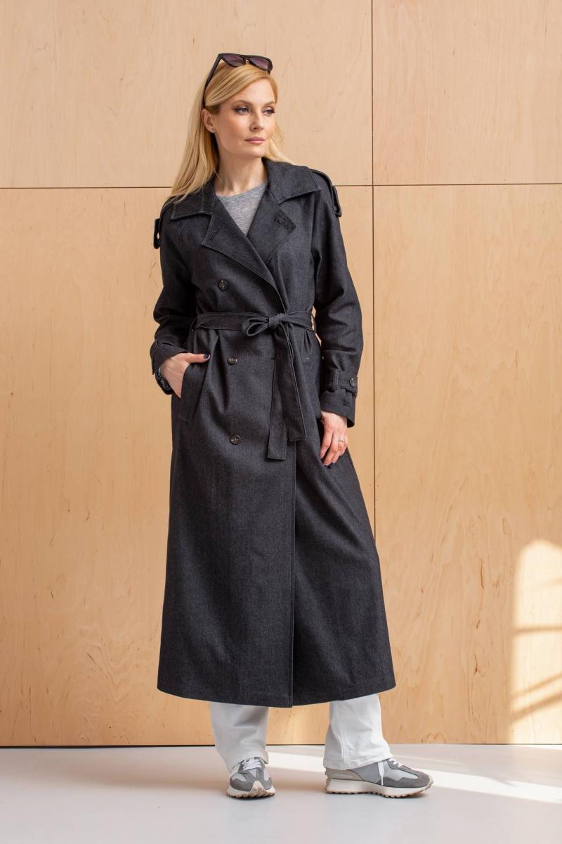 Плащ женский, удлинённый, двубортный, под съёмный пояс воротник на стойке, рукав покроя "реглан" с патами и погонами, застёжка спереди на петли и пуговицы, по переду карманы с листочками, на спинке-кокетка, изделие на подкладке.