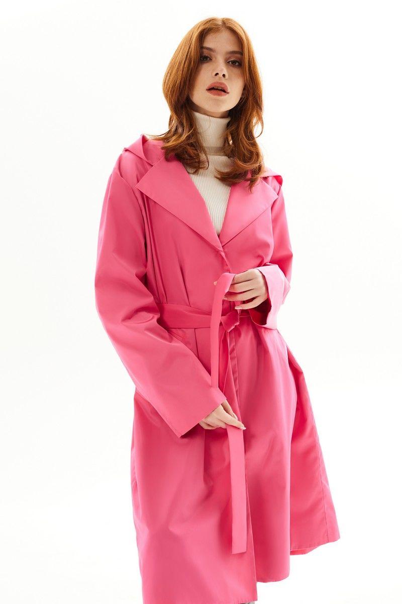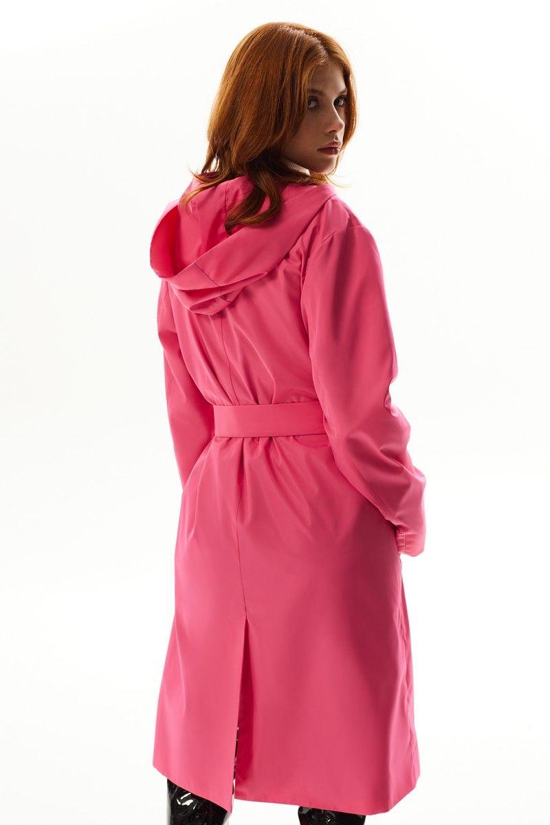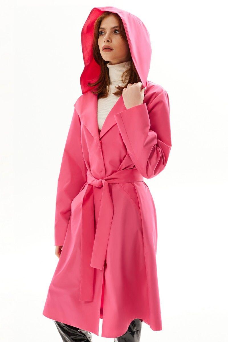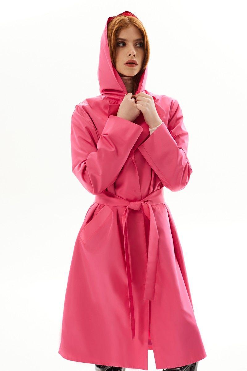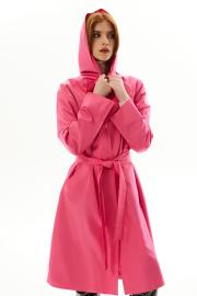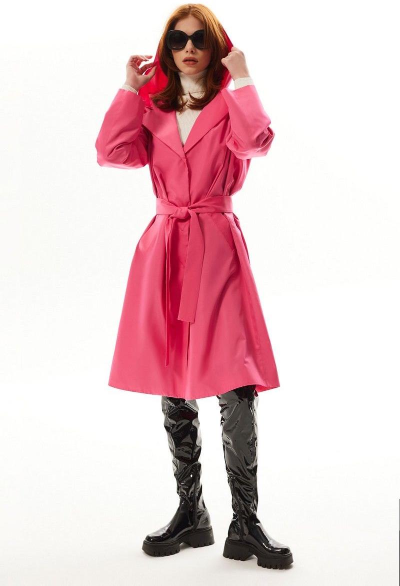 Плащ с центральной застежкой на пришивные кнопки, втачным капюшоном и отложными лацканами. По переду с прорезными карманами с листочками.. Спинка со средним швом. По низу рукавов- цельнокроенные отложные манжеты. Плащ на подкладке.