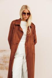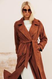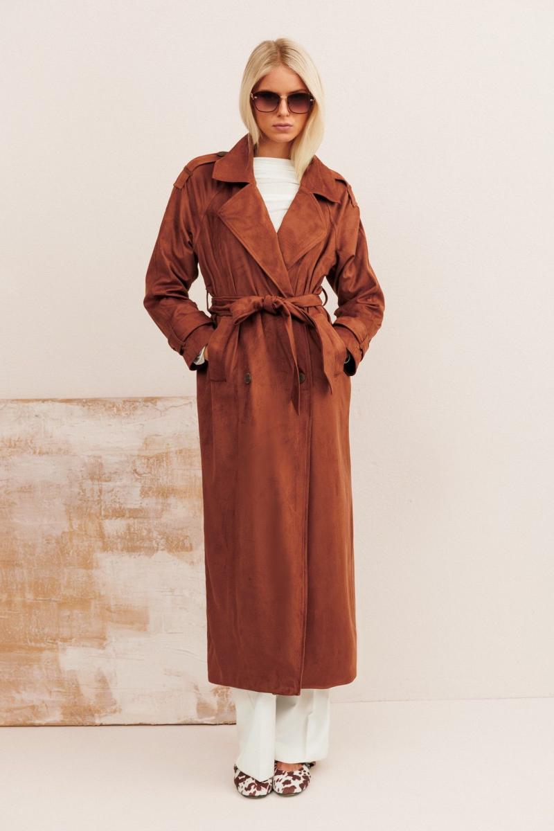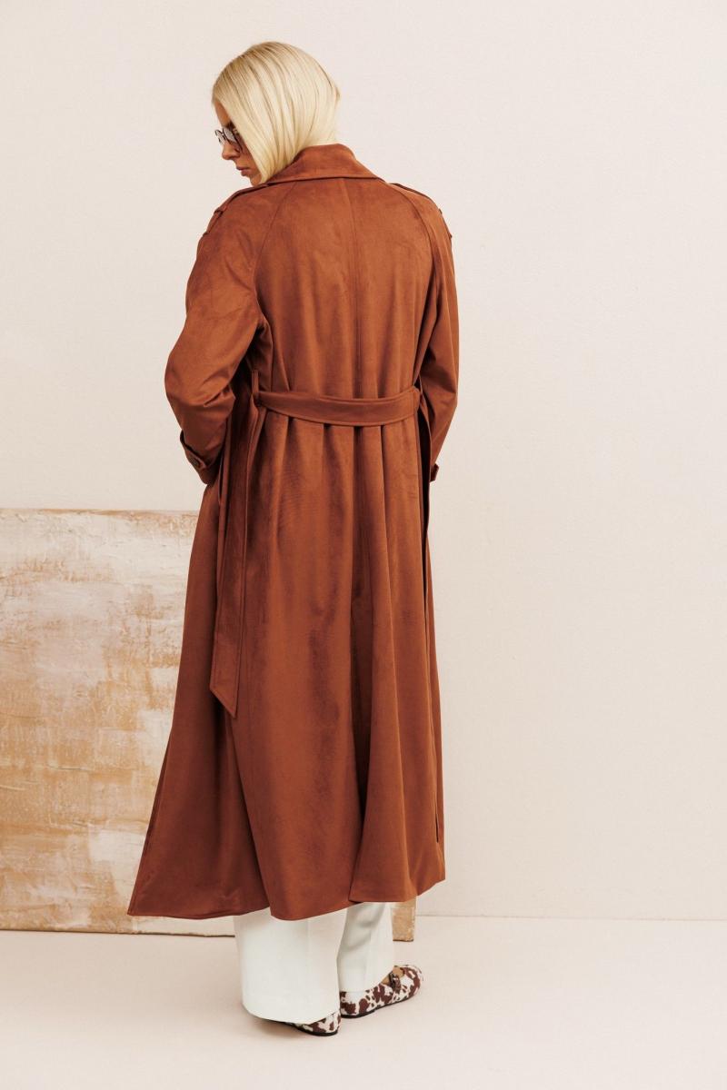 Тренчкот из эко-велюра: - прямой силуэт - рукава формы реглан - паты - воротник пиджачного типа - застёжка на пуговицы - боковые карманы - на подкладке - пояс из основной ткани в комплекте
