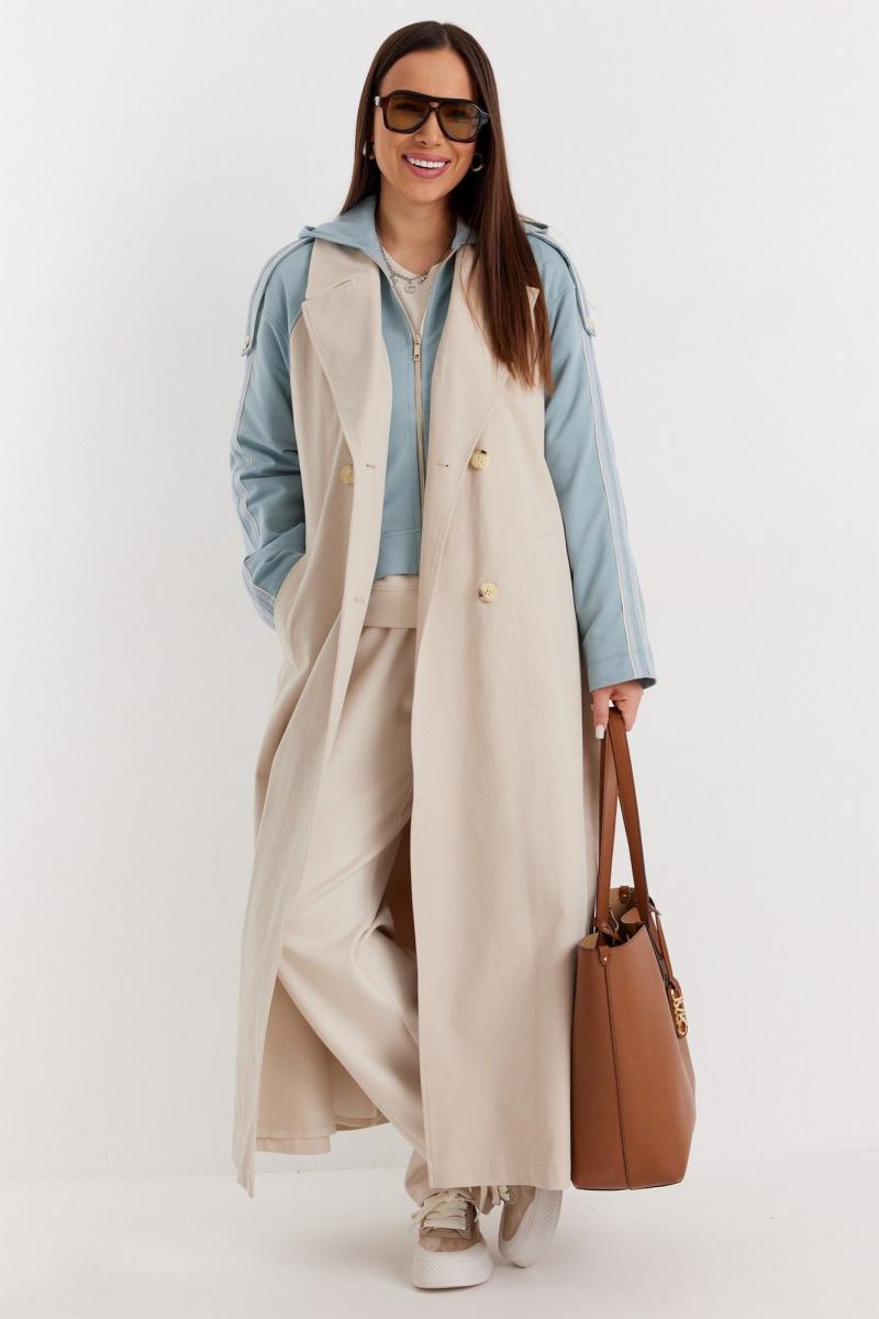 Невероятно стильный двубортный тренч классического свободного кроя, на подкладке. Рукава и отлетная спинка выполнены из комфортного трикотажного футера. Тренч дополнен съемной манишкой с капюшоном, выполненной из того же трикотажного футера. Центральная застежка на пришивные пуговицы. Притален за счет съемного пояса, выполненного из основной ткани. По бокам расположены удобные карманы. Длина тренча от плечевого шва 133см. Длина рукава 60 см.