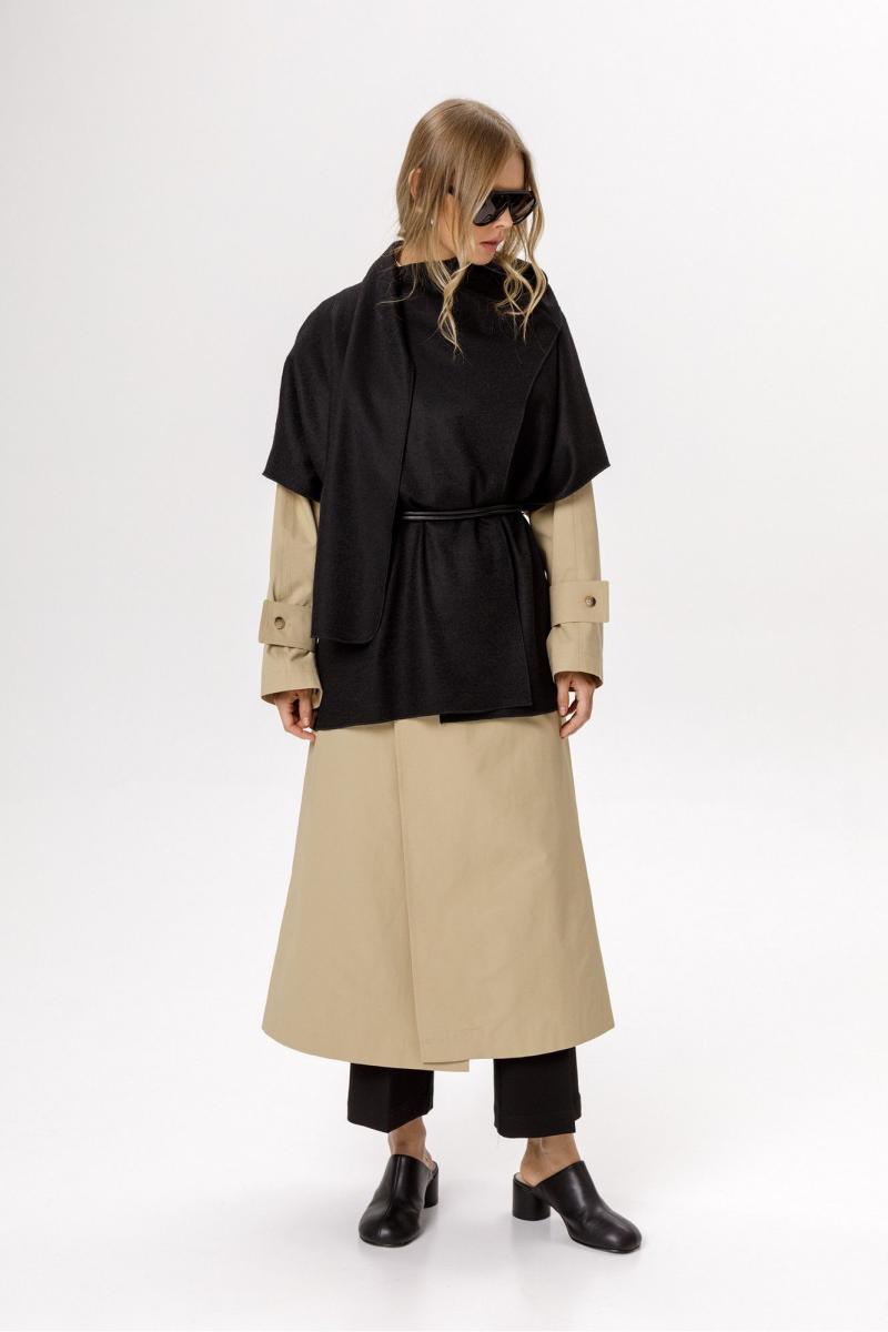 Детали: жилет прямого силуэта и свободного покроя, V- образный вырез горловины переда, без застежки, шлевки и съемный пояс, жилет на подкладке. Верхняя укороченная куртка свободного силуэта с цельнокроеными рукавами, воротник- стойка с вытачками, рукава длинные с патами, застежка по переду на одну петлю и пуговицу, спинка со средним швом, на подкладке. Тренч-трансформер позволяет создавать разные образы в зависимости от погоды и случая.