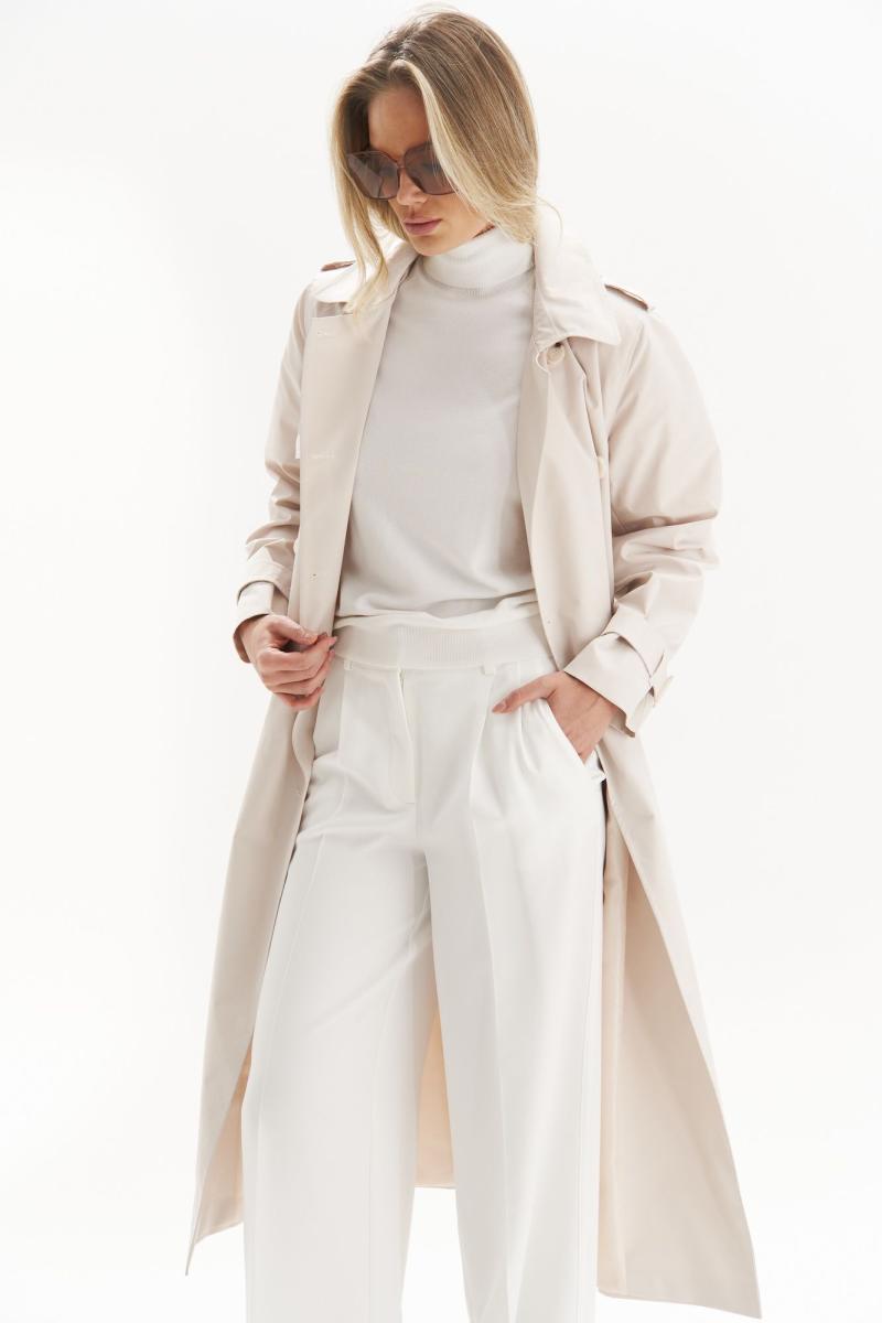 Этот изысканный плащ – воплощение современного стиля и функциональности. Классический двубортный крой дополнен акцентной линией плеч и отложным воротником, создавая силуэт, который подчеркивает фигуру и добавляет образу нотки аристократичности. Благодаря регулируемому поясу можно подчеркнуть талию, а лаконичные пуговицы в тон ткани придают завершенность дизайну. Практичные карманы и продуманные детали делают этот плащ идеальным выбором для межсезонья. Сочетайте его с классическими брюками и лоферами для элегантного образа или носите с кедами и джинсами для расслабленного городского стиля. Создай роскошный и уверенный образ с этим стильным плащом! Плащ женский, прямого силуэта, выполнен из плащевой ткани, на подкладке, с двубортной застежкой на 7 петель и 10 декоративных пуговиц до верха (размер и цвет фурнитуры может незначительно отличаться от фото), для повседневной носки. Борта могут быть застегнуты до верха, или расстегнуты с разложенными в разные стороны лацканами. Плащ со съемным поясом и декоративной пластиковой пряжкой, с настрочными шлевками по линии талии. Перед и спинка с отрезным бочком. Перед с прорезными карманами с листочками. Правая часть переда с отлетной кокеткой. Спинка с отлетной кокеткой, со средним швом в нижней части которого обработана шлица. Горловина оформлена стояче-отложным воротником со стойкой. Рукава втачные, двухшовные, по низу с настрочными шлевками, с патами с декоративными пластиковыми пряжками. Плечевые швы с погонами, застегивающимися на 1 петлю и 1 пуговицу. "46 размер Длина плаща по среднему шву спинки - 121,0 см (±2,0 см), Ширина на уровне глубины проймы - 55,0 см (±1,0 см), Ширина на уровне линии талии - 55,5 см (±1,0 см), Ширина на уровне линии бедер - 60,0 см (±1,0 см), Длина плеча - 12,0 см (±0,5 см). Длина рукава - 63,0 см (±1,0 см), Ширина рукава вверху - 20,5 см (±1,0 см), Ширина рукава внизу - 15,0 см (±0,5 см) 48 размер Длина плаща по среднему шву спинки - 121,0 см (±2,0 см), Ширина на уровне глубины проймы - 57,0 см (±1,0 см), Ширина на уровне линии талии - 57,5 см (±1,0 см), Ширина на уровне линии бедер - 62,0 см (±1,0 см), Длина плеча - 12,0 см (±0,5 см). Длина рукава - 63,0 см (±1,0 см), Ширина рукава вверху - 21,5 см (±1,0 см), Ширина рукава внизу - 15,0 см (±0,5 см) 50 размер Длина плаща по среднему шву спинки - 121,0 см (±2,0 см), Ширина на уровне глубины проймы - 59,0 см (±1,0 см), Ширина на уровне линии талии - 59,5 см (±1,0 см), Ширина на уровне линии бедер - 64,0 см (±1,0 см), Длина плеча - 12,0 см (±0,5 см). Длина рукава - 63,0 см (±1,0 см), Ширина рукава вверху - 22,5 см (±1,0 см), Ширина рукава внизу - 15,5 см (±0,5 см) 52 размер Длина плаща по среднему шву спинки - 123,0 см (±2,0 см), Ширина на уровне глубины проймы - 62,0 см (±1,0 см), Ширина на уровне линии талии - 62,5 см (±1,0 см), Ширина на уровне линии бедер - 67,0 см (±1,0 см), Длина плеча - 12,3 см (±0,5 см). Длина рукава - 63,5 см (±1,0 см), Ширина рукава вверху - 23,0 см (±1,0 см), Ширина рукава внизу - 16,0 см (±0,5 см) 54 размер Длина плаща по среднему шву спинки - 123,0 см (±2,0 см), Ширина на уровне глубины проймы - 64,0 см (±1,0 см), Ширина на уровне линии талии - 64,5 см (±1,0 см), Ширина на уровне линии бедер - 69,0 см (±1,0 см), Длина плеча - 12,3 см (±0,5 см). Длина рукава - 63,5 см (±1,0 см), Ширина рукава вверху - 24,0 см (±1,0 см), Ширина рукава внизу - 16,0 см (±0,5 см) 56 размер Длина плаща по среднему шву спинки - 123,0 см (±2,0 см), Ширина на уровне глубины проймы - 66,0 см (±1,0 см), Ширина на уровне линии талии - 66,5 см (±1,0 см), Ширина на уровне линии бедер - 71,