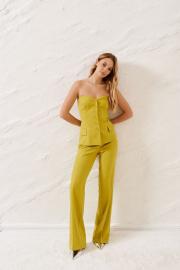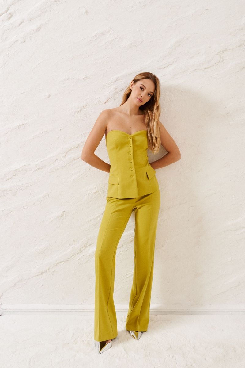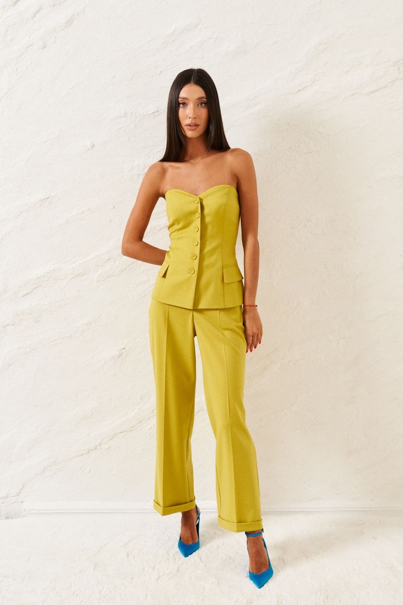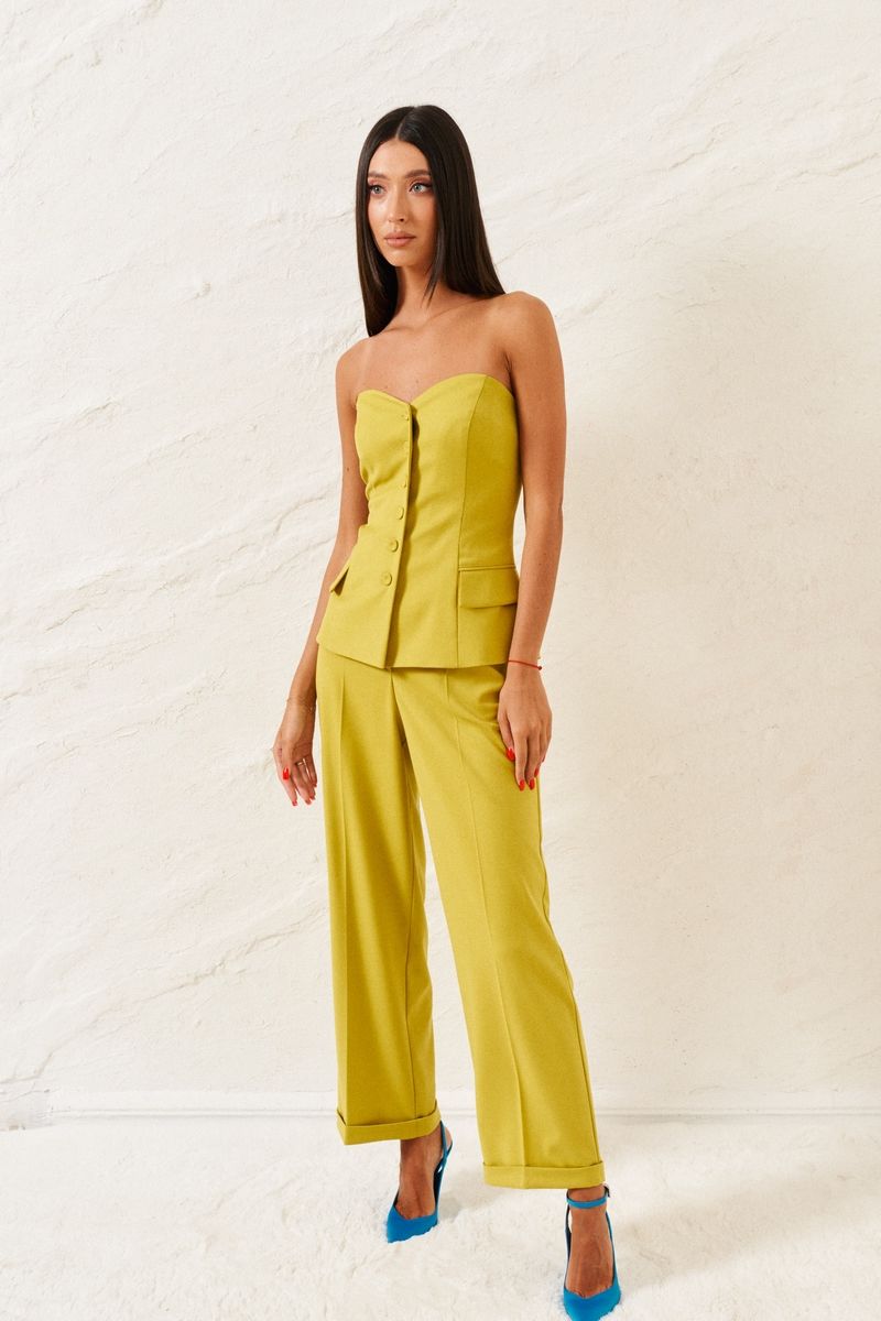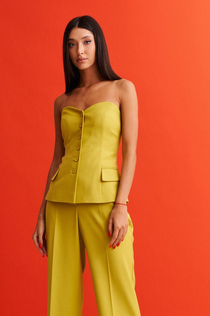 Жилет с открытыми плечами выполнен из легкого костюмного полотна грушевого цвета. Характеристики: открытые плечи, подкладка, фигурный вырез горловины, застежка центральна на петли пуговички , пуговички декорированы тканью основного изделия, имитация карманов с клапаном. Длина по спинке 38 см.