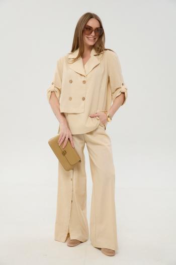 Пальто-пиджак прямого свободного кроя выполнен из фактурной мягкой ткани, коричневого цвета. Характеристики: прямой свободный крой, подкладка, подплечники, воротник с остроугольным лацканом, застежка центральная на петли - две пуговицы, по переду функциональные карманы с клапаном, рукав втачной, спинка цельнокройная. Длина по спинке 80, длина рукава 61 см.