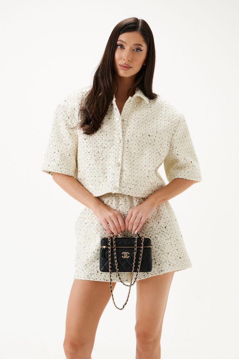 Укороченный жакет, прямого кроя, выполнен из джинсовой ткани белого цвета на люрексной основе с перфорацией и пайетками. Воротник отложной, по центру полочки причная планка с пробивными кнопками, спинка цельная, рукав втачной , одношовный, короткий.