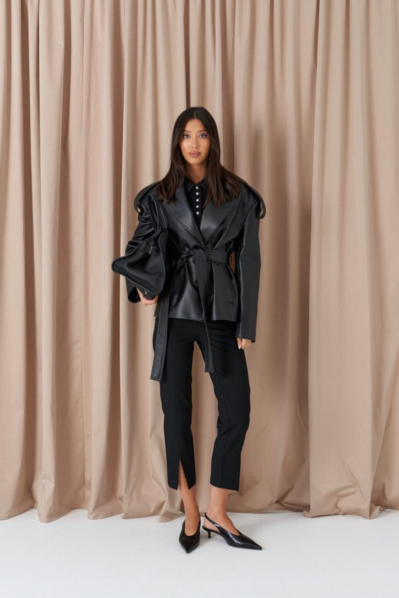 Куртка прямого кроя выполнен из эко-кожи черного цвета. Характеристики: прямой крой, брендированная покладка, подплечники, отложной воротник с остроугольным лацканом, застежка центральная на петли пуговицы, по линии талии шлевки, в комплекте пояс из ткани основного изделия, рукав втачной. По линии плеча погон с пуговицей, в среднем шве заднего полотна изделия шлица 17 см. В боковых швах изделия карманы. Длина по спинке 65 см, длина рукава 58 см.