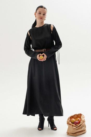 Жакет прямого свободного кроя, выполнен из костюмной ткани черного цвета. Характеристика: V-образный вырез горловины, отложной воротник, застежка центральная на две петли пуговицы, функциональные карманы с клапанами, брендированная подкладка, широкое плечо, подплечники, рукав втачной, на манжете функциональные пуговицы, в среднем шве заднего полотна изделия шлица 51 см. Длина изделия по центральному щву по спине 118 см, длина рукава от края горловины 84 см.