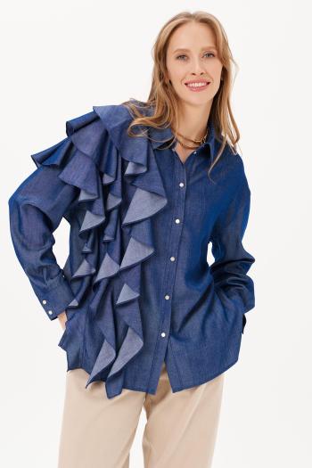 Жакет прямого кроя из костюмной ткани. По переду потайная застежка на петли. Горловина-стойка. Рукав втачной, есть подплечники. Жакет на подкладке. По переду жакета оттелка из декоративной тесьмы. Длина жакета 50 см.