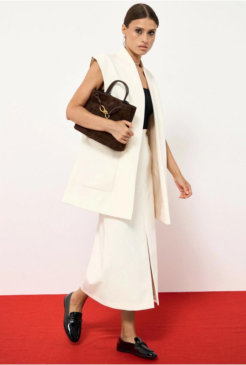 Жилетка прямого кроя, из костюмной ткани, без застежки, в комплекте декоративный пояс, по переду боковые карманы, линия плеча спущена. Жилет на подкладке. Длина жилетки по спинке: 78 см