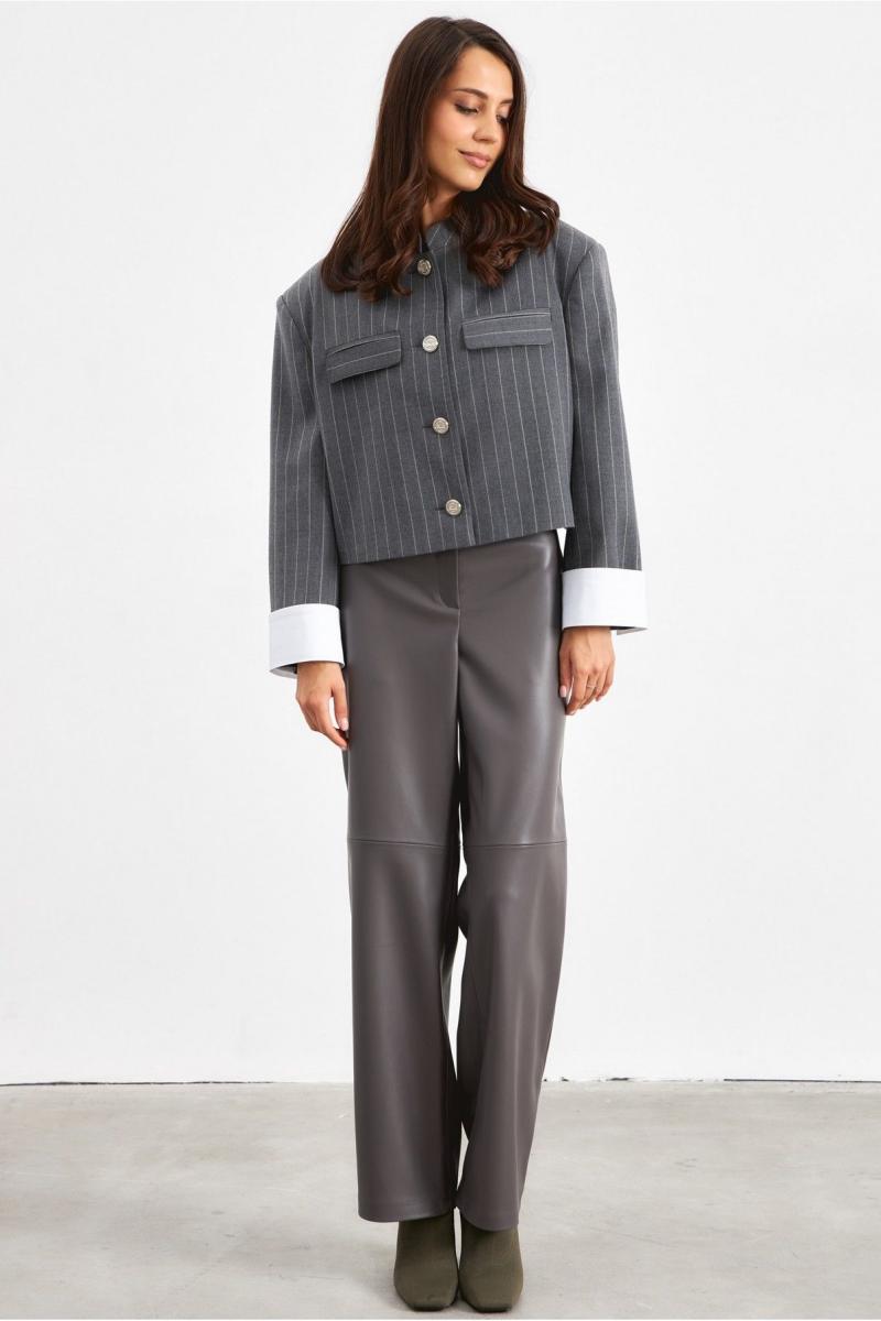 Укороченный жакет, выполнен из костюмной ткани серого цвета в полоску. Жакет однобортный, по переду застежка на пуговицы в стиль всего жакета. Рукав втачной, по низу съемная манжета, декорированная пуговицей.
