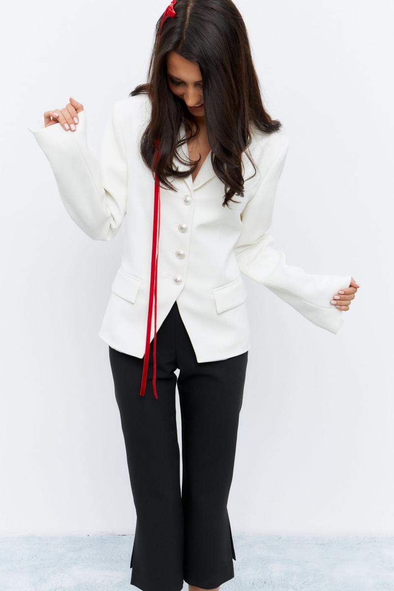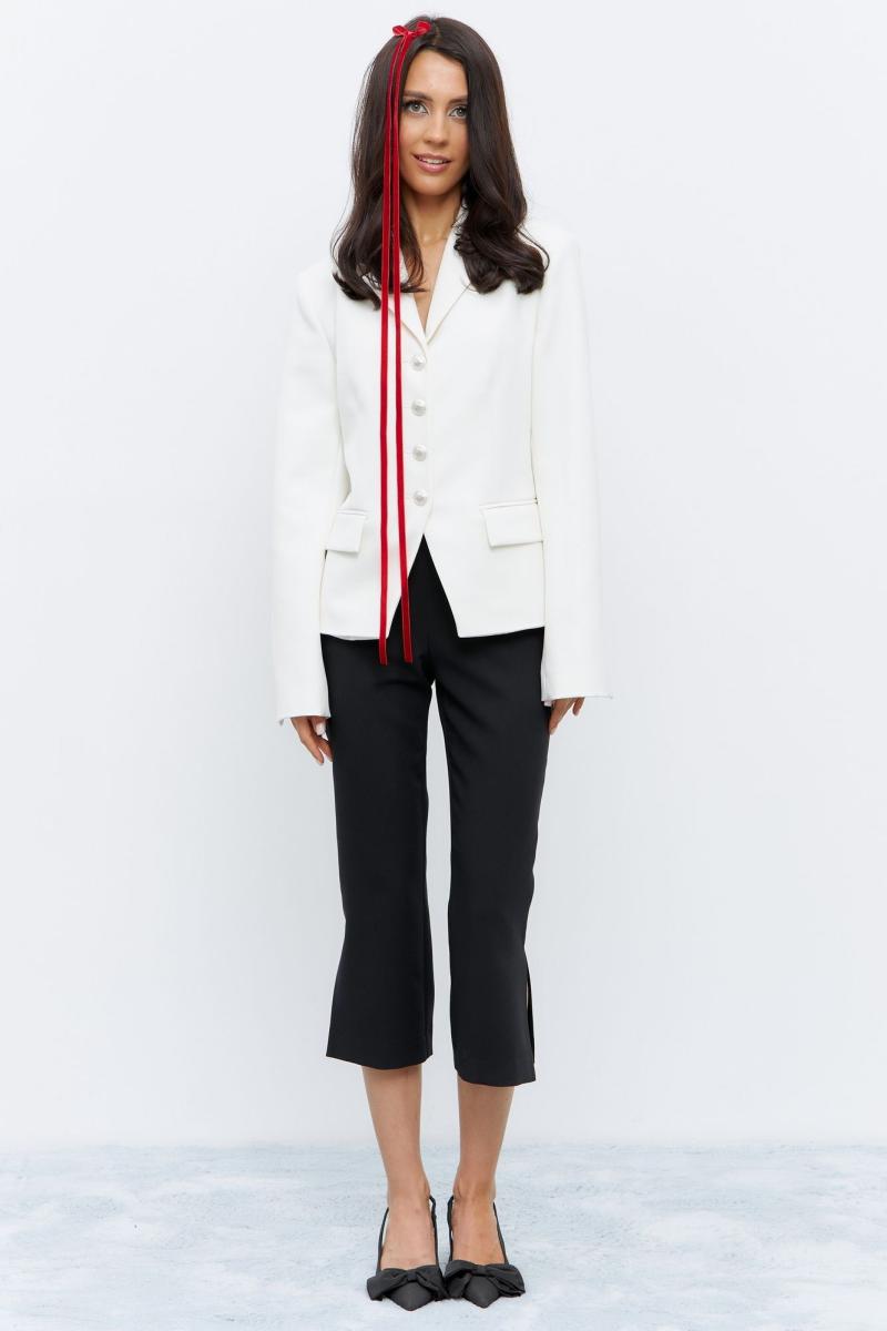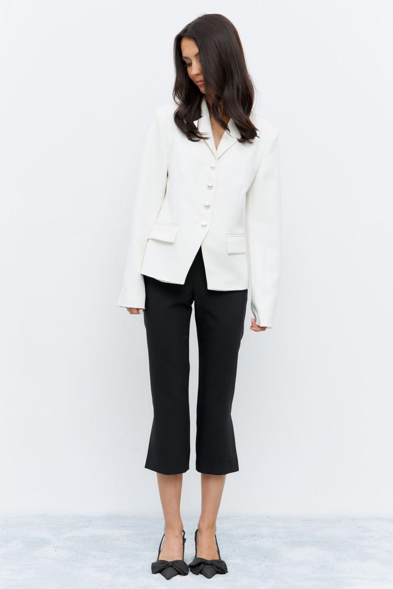 Жакет приталенного силуэта, в белом цвете. По переду карманы с клапанами, жакет декорирован функциональными пуговицами по переду изделия.