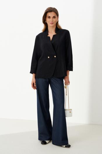 Жакет приталенного силуэта из плотной костюмной ткани черного цвета, на притачной подкладке. Модель с глубоким V-образным вырезом горловины и небольшим воротником-стойкой по спинке. Центральная застежка на пять навесных петель и декоративные пуговицы. Полочка сложного кроя с веерными рельефами, формирующими акцент на талии, и высокими разрезами по боковым швам. Плечевой пояс подчеркнут втачными длинными рукавами с объемной сборкой и высокой головкой.