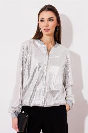 Жакет из трикотажного полотна с пайетками. Прямого силуэта, внизу на манжете из довяза. С центральной застежкой на разьемную декоративную молнию с отделочным слайдером, под молнию пришита декоративная атласная планка. Горловина округлая с довязом. Рукав втачной одношовный, внизу с довязом. Жакет на атласной подкладке в тон.