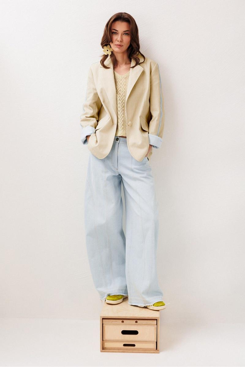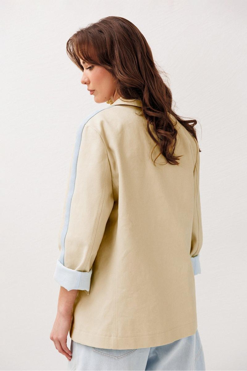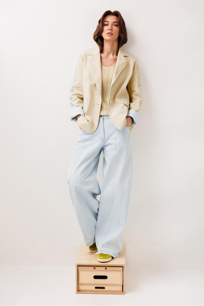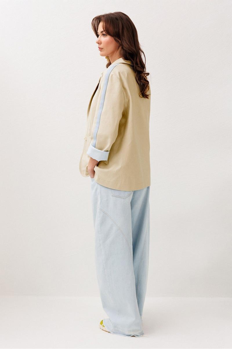 Жакет из джинсовой ткани с велюровым эффектом полуприлегающего силуэта с втачным двухшовным рукавом с лампасом из отделочной ткани. Полочка с центральной застежкой на петлю-пуговицу, вытачкой и имитацией кармана с клапаном. Жакет с отрезным бочком, переходящим на полочку и на спинку. Воротник пиджачного типа с отрезной стойкой. Рукава жакета на подкладке.