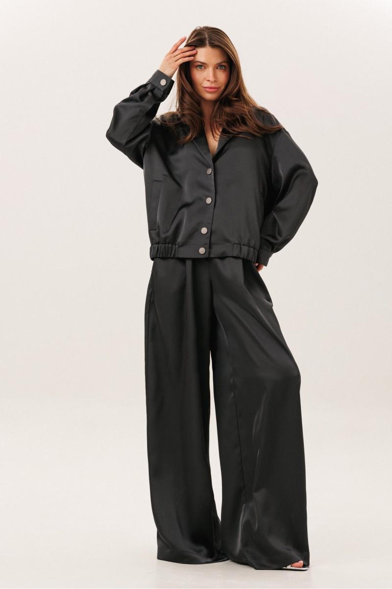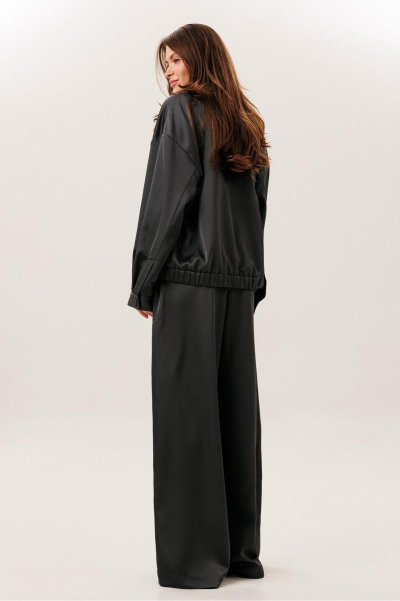 Жакет прямого силуэта до линии бедер, со спущенной линией плеча. Рукав двухвовный со шлицей. По низу манжета на одну кнопку. По переду прорезные карманы. По низу пояс слегка собран на эластичную резинку. Застежка на кнопки.