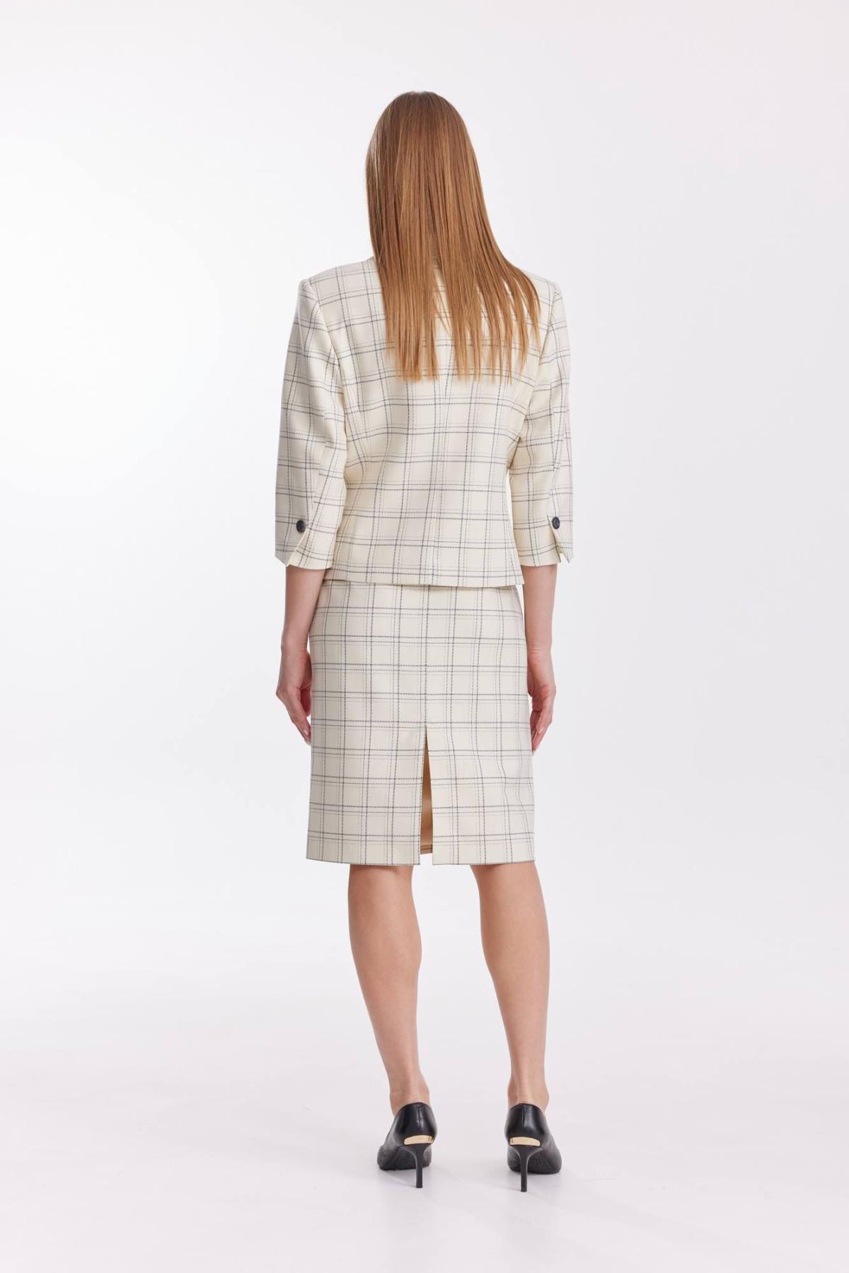 Жакет на подкладке с рукавами три четверти и пуговицами в тон. Клетчатый узор придаёт образу элегантность и изысканность, делая его подходящим для деловых встреч, офиса и других формальных мероприятий. Двубортный жакет создают женственный и утончённый силуэт.