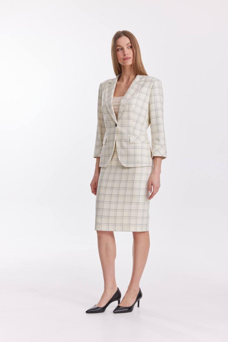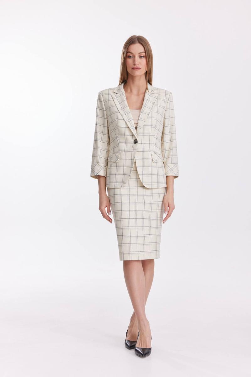 Жакет на подкладке с рукавами три четверти и пуговицами в тон. Клетчатый узор придаёт образу элегантность и изысканность, делая его подходящим для деловых встреч, офиса и других формальных мероприятий. Приталенный силуэт жакета создают женственный и утончённый образ. Длина 56см.