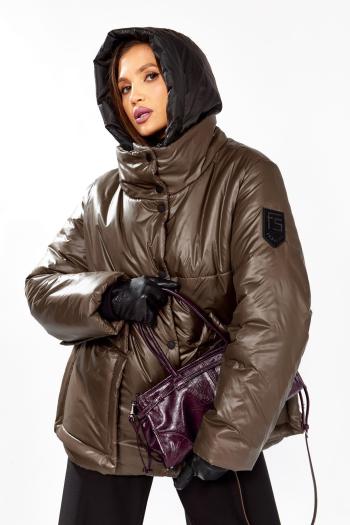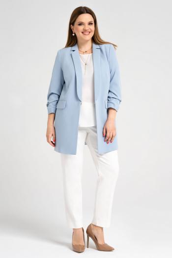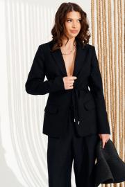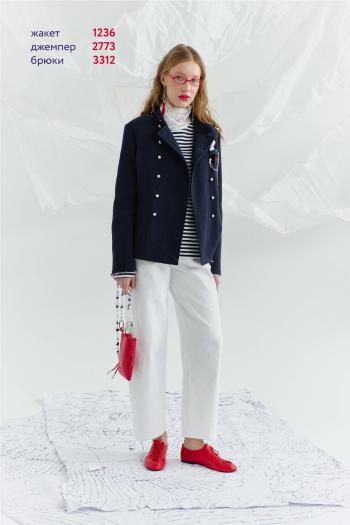 Жакет умеренного объема, полуприлегающего силуэта, с центральной застежкой на завязки, отложным воротником и лацканами пиджажного типа, на подкладке. Детали переда с талиевыми вытачками, отрезными бочками и прорезными карманами с клапанами и двумя обтачками. Спинка со средним швом и отрезными бочками. Рукав втачной, двухшовный, длинный. Длина изделия на модели вдоль середины спинки — 66,5 см (допустимое отклонение +/- 1 см)