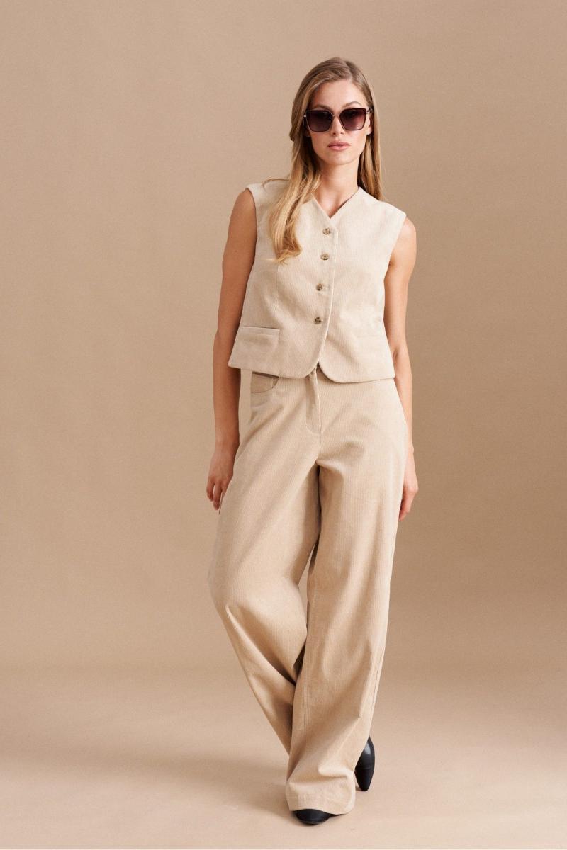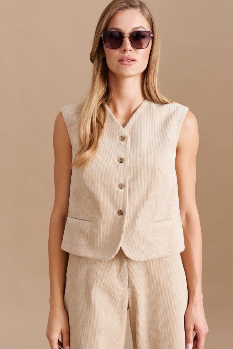 Жилет женский прямого силуэта из вельвета. Изделие на подкладке. По переду функциональные прорезные карманы. Спинка с хлястиком на пуговицах для регулировки посадки. Застежка фронтальная на петли, пуговицы.